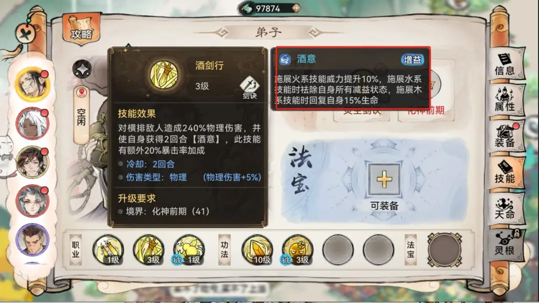 这样我们就可以将小师弟替换成李清圣,小师妹替换成白子灵,从而完成二师兄杨安+兵职业弟子+白子灵+李清圣+大师兄韩飞羽的阵容搭配,这就是我们第二天前期阵容了,后面等级升上去之后解锁禅修弟子我们再将另一个前排替换掉