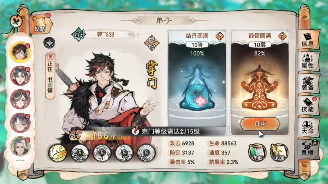 首先我们完成日常任务获取声望后可以将我们的宗门等级升到15级,这时候弟子可以突破结丹圆满,渡劫为元婴,弟子等级上限30级变成40级,然后我们可以从仙迹福地获得大量灵草,炼制大量丹药用于弟子等级的提升,这是我们今天最主要的战力提升途径