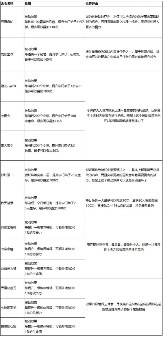 奇遇秘境是我们获取古宝的主要来源,许愿树活动等也可以获取古宝。古宝增加的是全弟子属性,而且拥有不俗的被动效果,当古宝数量起来后,对于战斗力的提升也非常的重要。