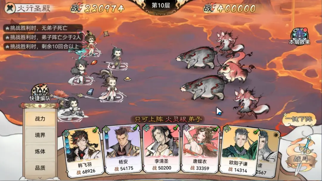 第一天只会开启火行殿,后续逐渐开放。五行圣殿玩法特点是只能派遣相应灵根弟子挑战,我们的应付方案是养成具有多重灵根弟子进行挑战,我们前面提到的二师兄杨安就属于全能的五灵根弟子,可在金木水火土殿都可上阵挑战,养成性价比极高。