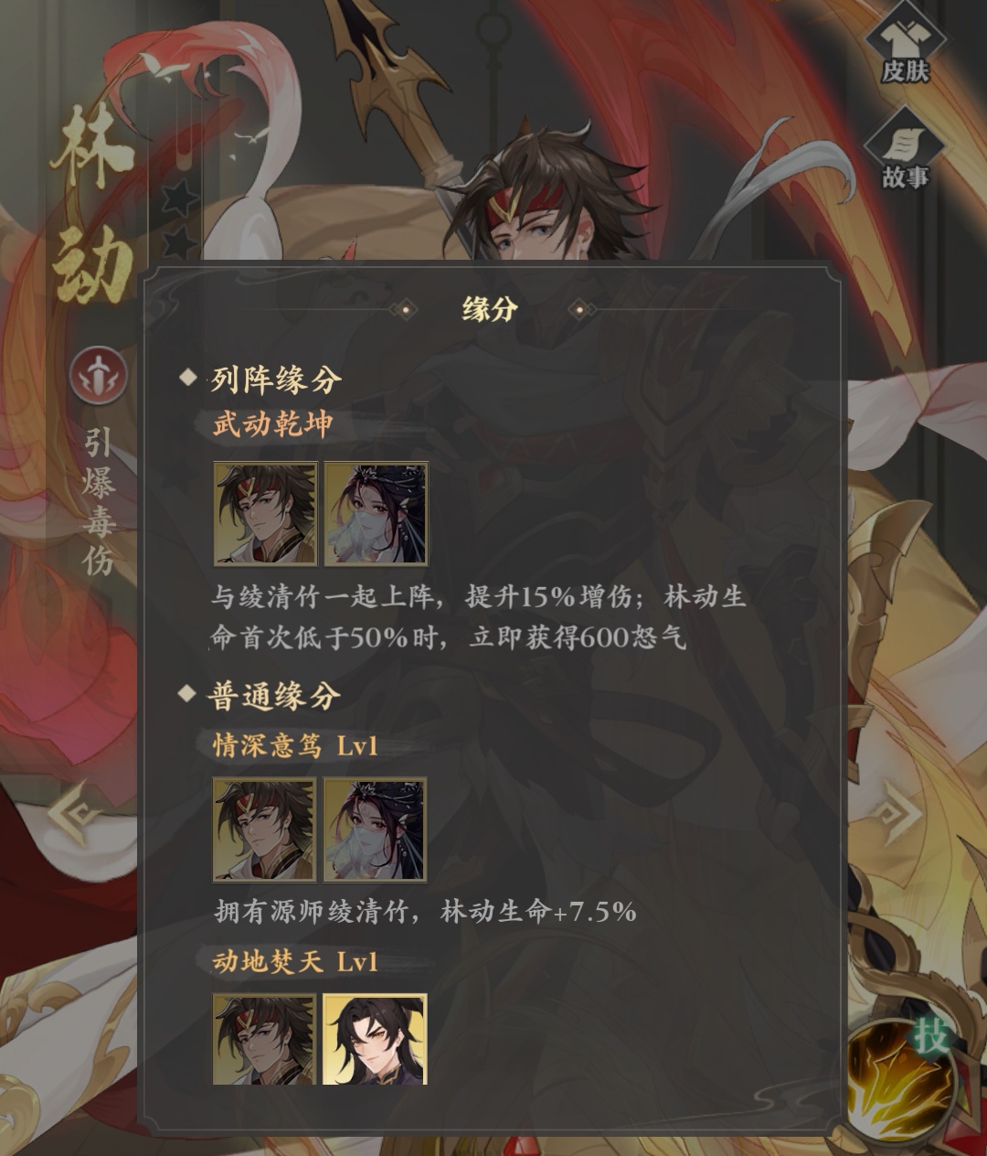 缘分效果:自身+15%增伤,自身血量低于50%时,回复600点怒气。