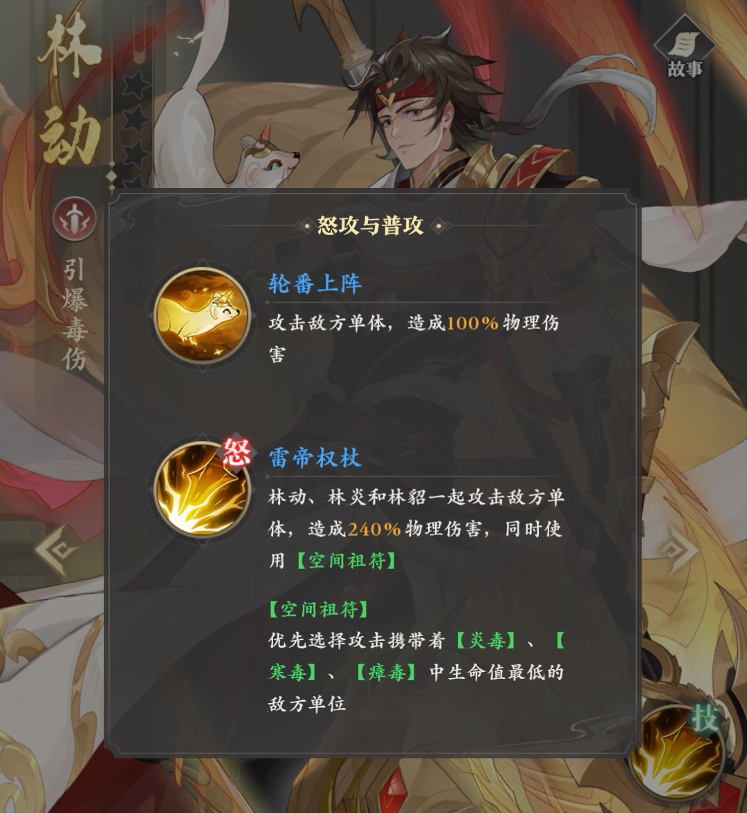 林动、林炎和林貂一起攻击敌方单体,造成240%物理伤害,优先攻击携带【毒】目标中血量最低的单位。