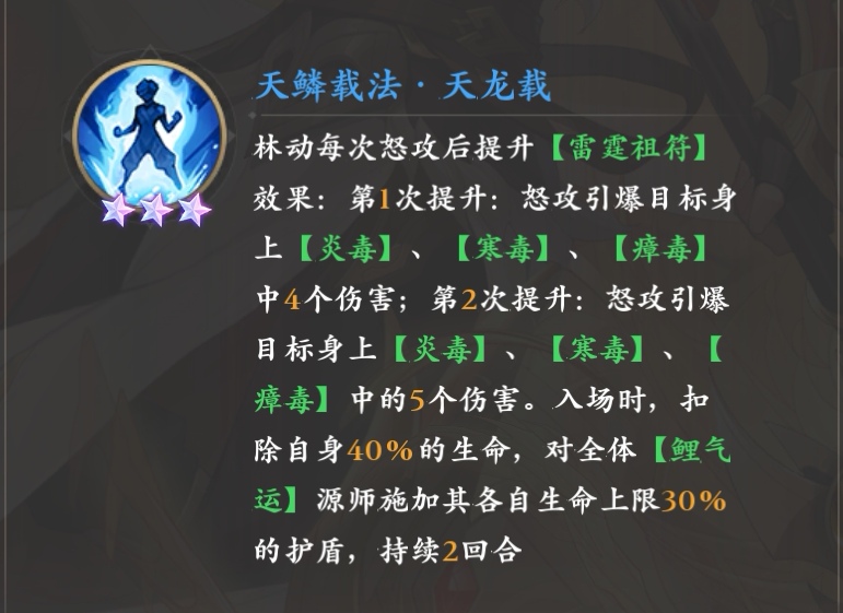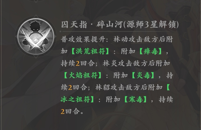 同样花里胡哨的一堆描述,实际就是普攻附加随机【毒】状态2回合。林动的普攻是他们仨随机出来一个人攻击1下,并不会同时附加多个【毒】状态,并且这个天赋只对普攻有加成,对怒攻没任何效果。
