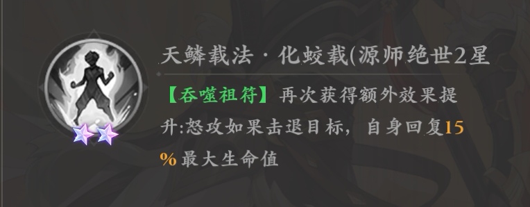 缘分效果:自身+15%减伤,自身血量首次低于50%时回复25%血量。