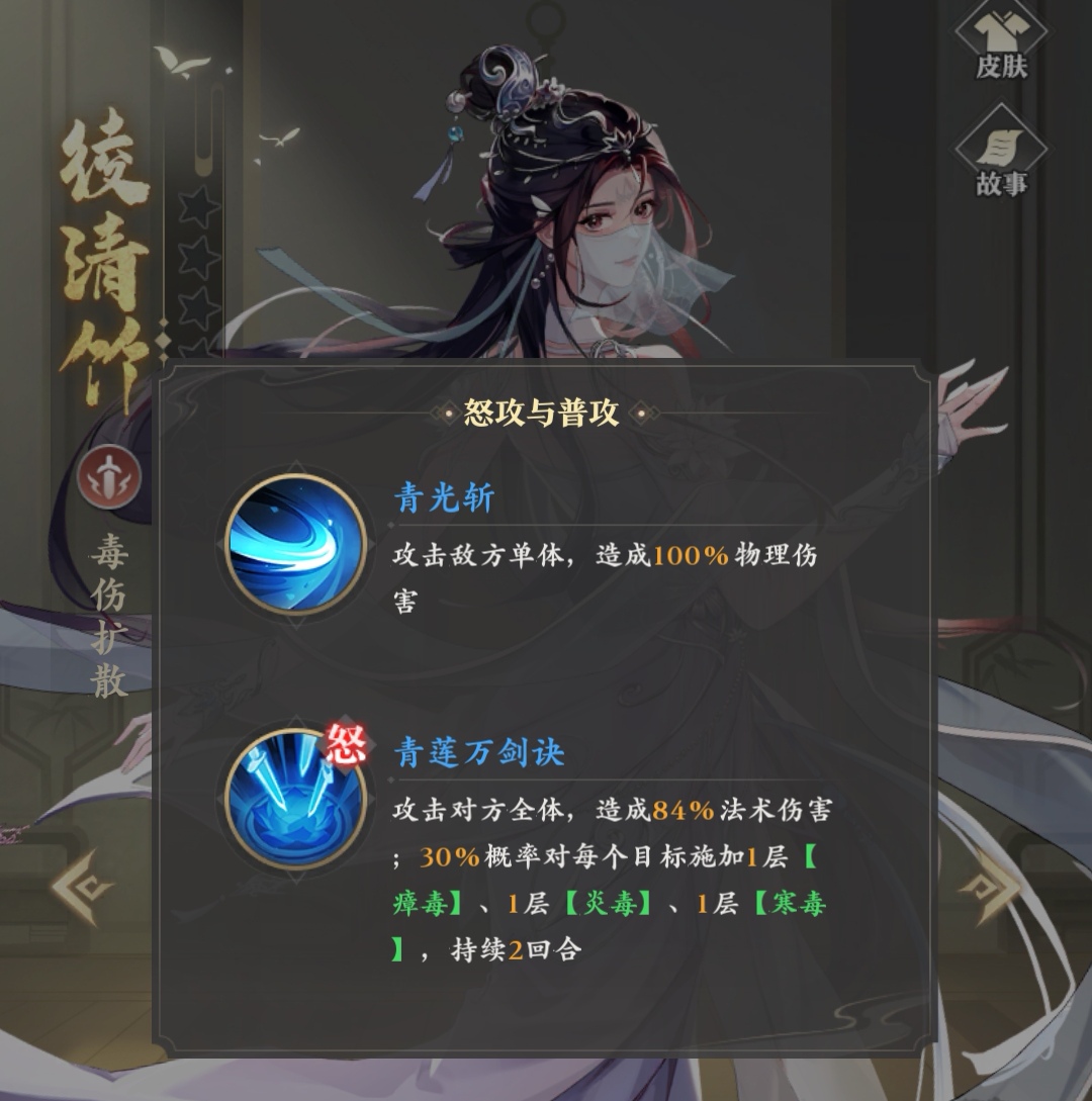 全体攻击84%的法术伤害,30%概率对每个目标施加1层【瘴毒】、1层【炎毒】、1层【寒毒】,持续2回合。
