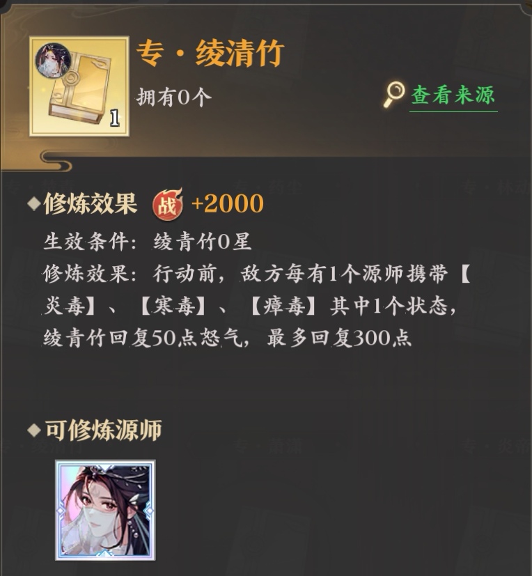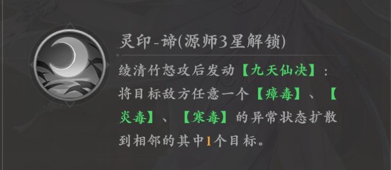 绫清竹的核心天赋,大幅提高了阵容整体的挂毒能力。基本只需要任意1个能挂毒的源师和她自己两个人,就能迅速把毒挂满敌方全体。尤其是配合专属源术回怒效果拉满。