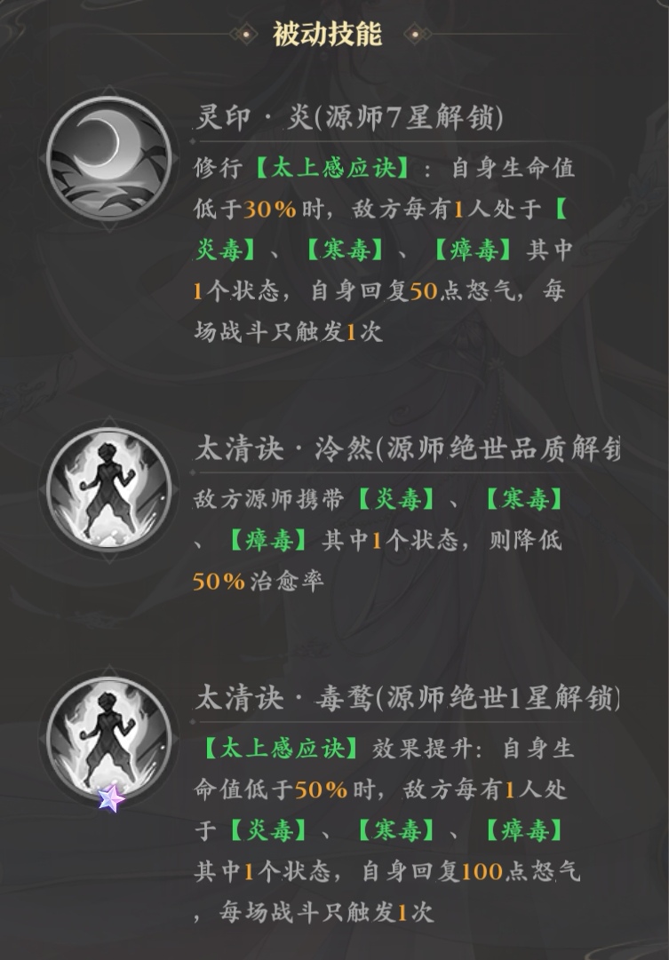 血量低于30%/50%时,敌方每有1个任意【毒】状态,自身回复50点/100点怒气,每场战斗只触发1次。