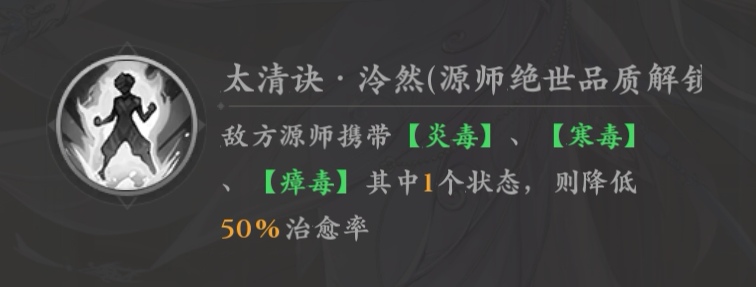 绝世:敌方携带任意【毒】状态时,降低50%治愈率。
