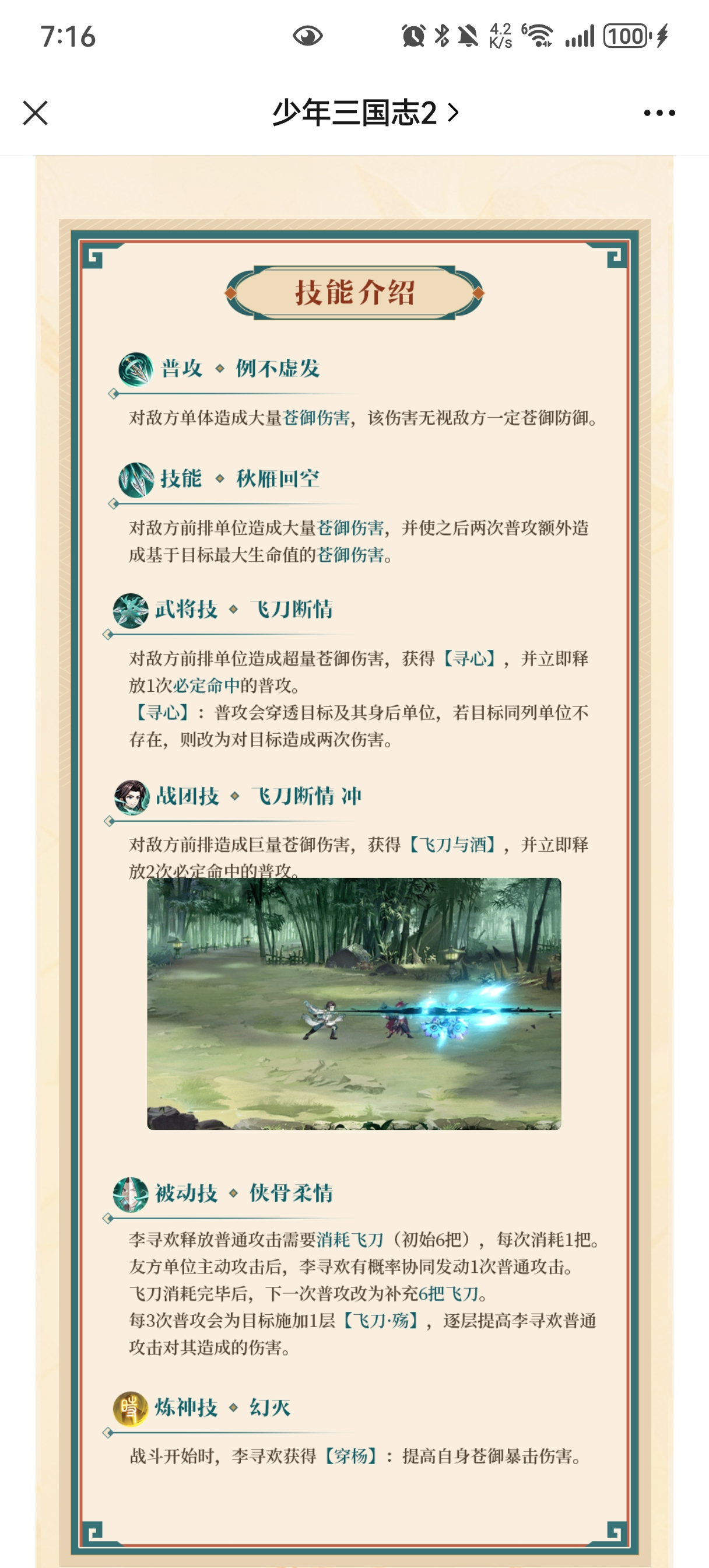 战斗开始时,李寻欢获得【穿杨】:提高自身苍御暴击伤害。