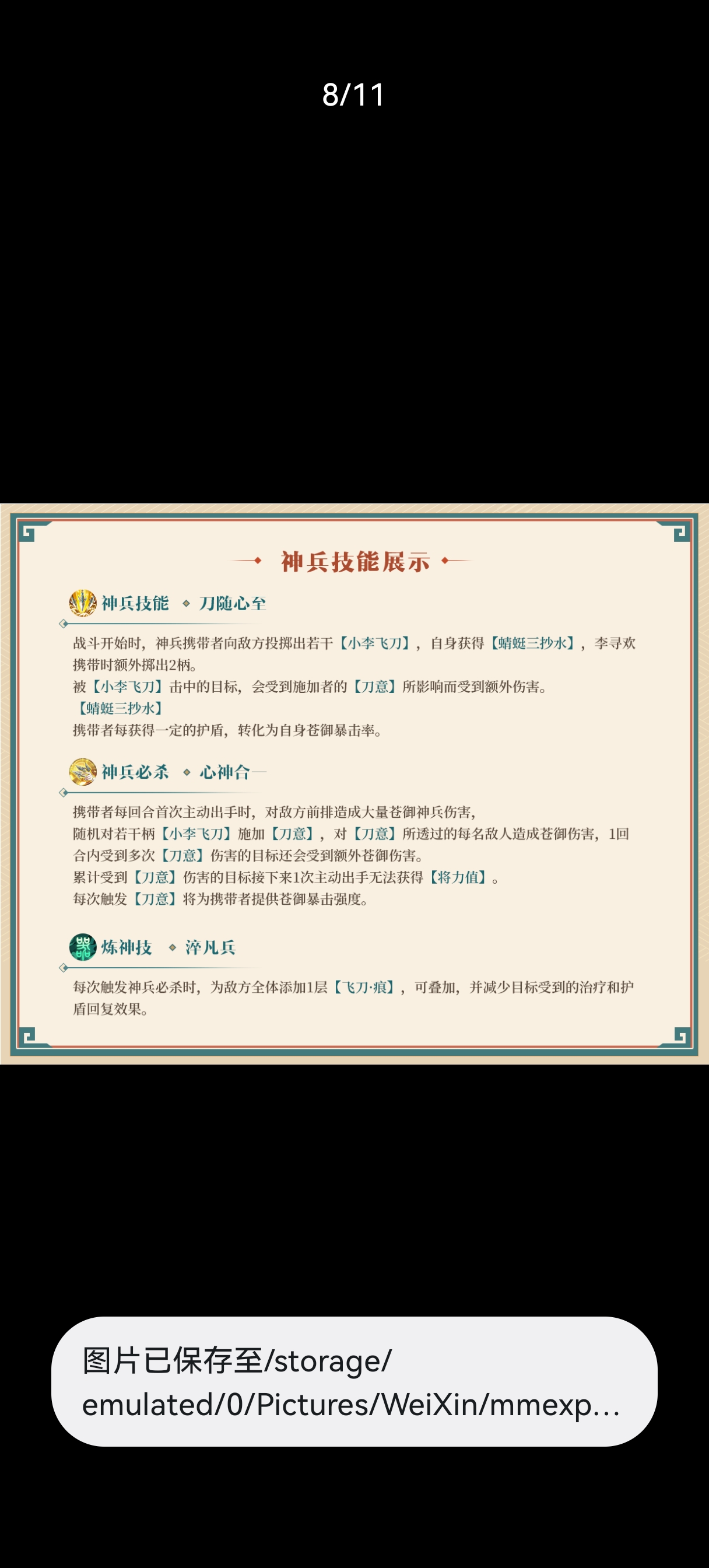 神兵技能◇刀随心至总评:没什么好说的,星宫也没放出来,武将对标吕布,技能描述很像高顺的感觉,炼神拉闸,看不去了。神兵就更离谱了,这描述真感觉不如诛仙剑阵,苍金1.5的神兵吗?