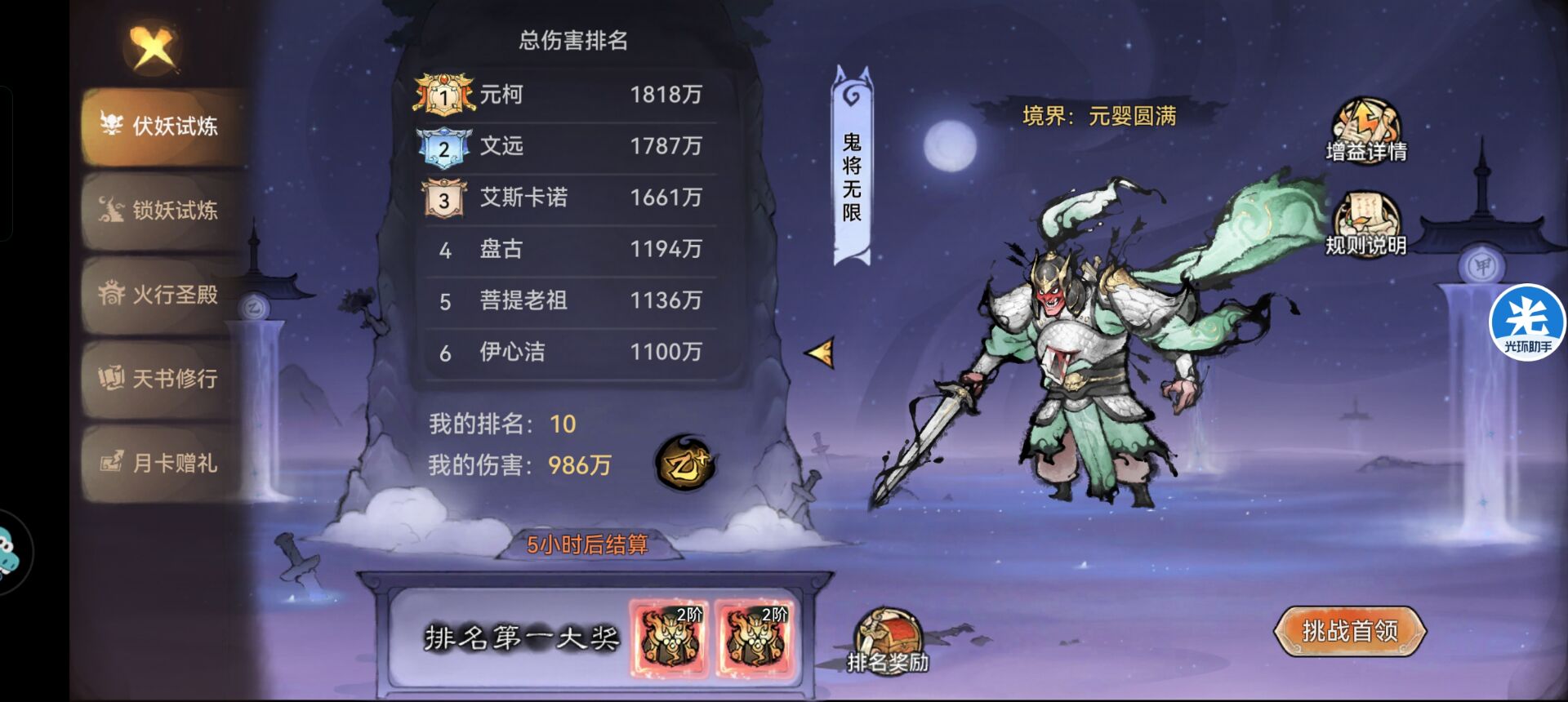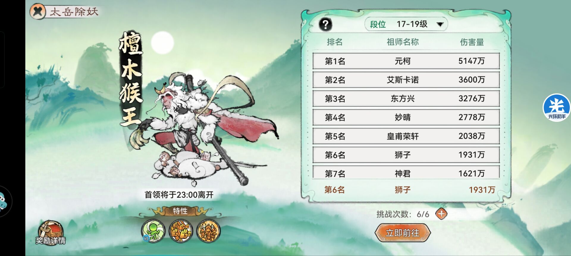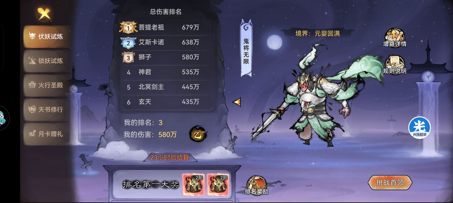 3:第三天核心目标—【大岳除妖】和【鬼将无限】提升完弟子的境界以及做完法宝以后,就可以来打我们新活动世界boss【大岳除妖】以及【鬼将无限】一定要先做完上面的,才来打这2个活动,因为这时候我们队伍整体实力得到了大幅度的提升,打这些boss输出更高。