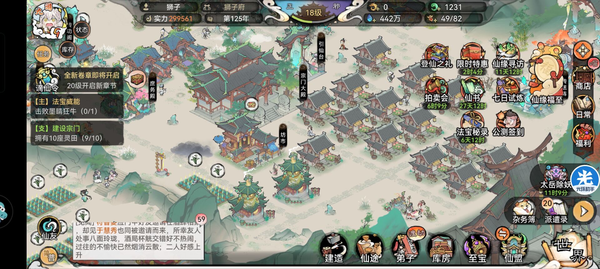 首先老规矩和大家分享一下第二天的最终战况:①宗门等级第2天卡在了17级,这个没有办法0氪平民宗门升级慢。所以第2天到不了18级开启法宝系统。