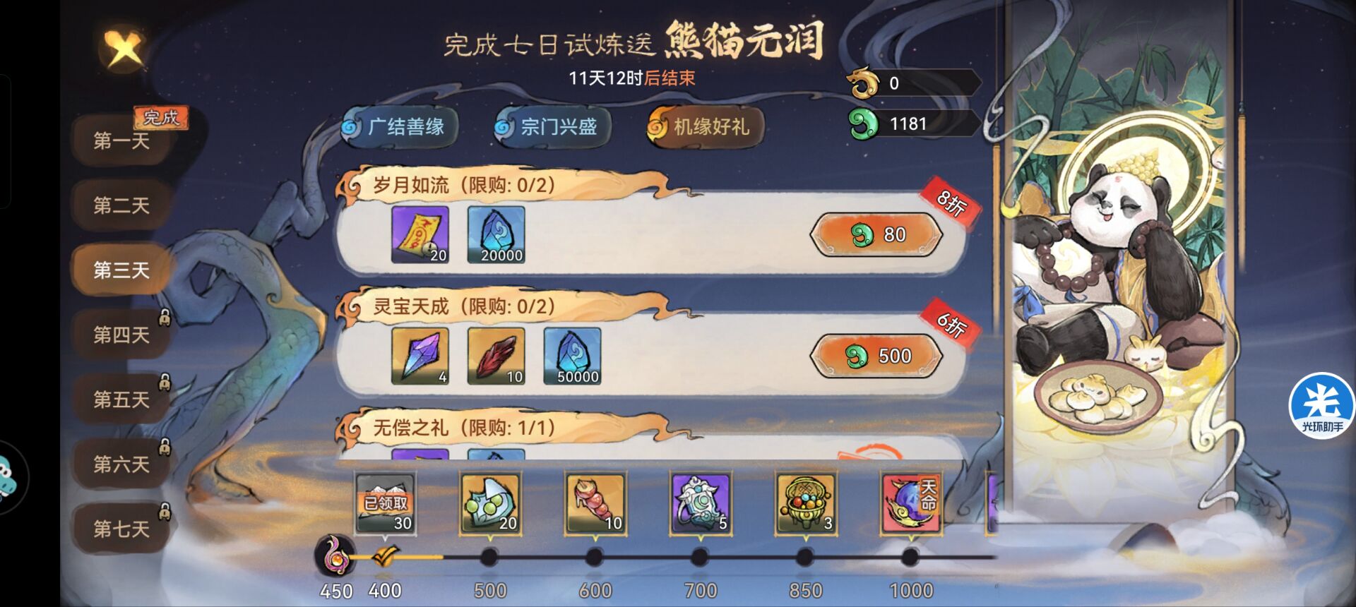 ⭐然后这里第三天的【云游仙人】有2个师门令可以增加100点令牌,是必买的。可以增加我们的发育速度。