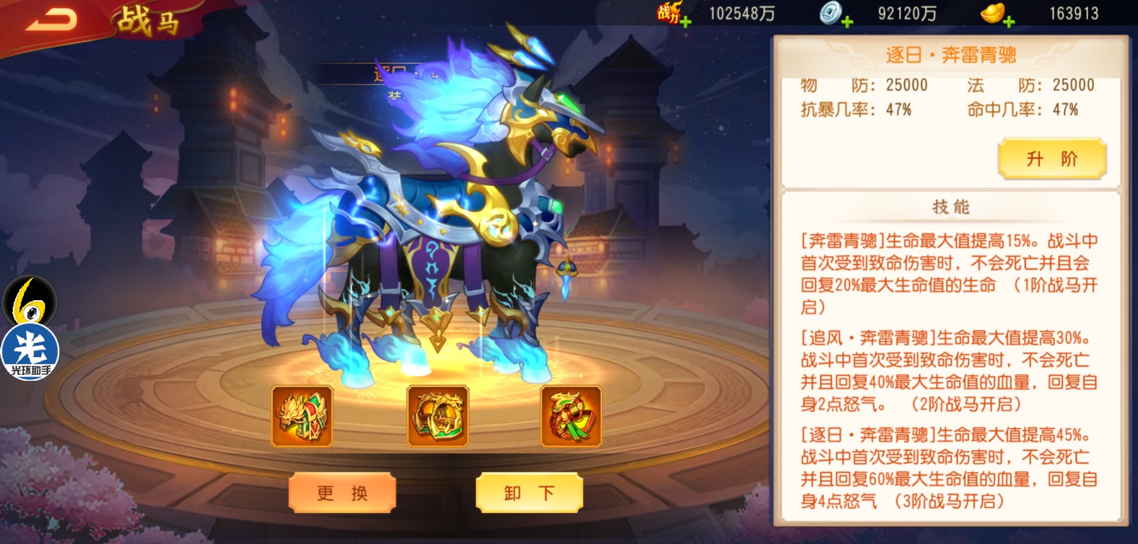 追日奔雷马,不但可以提高夏侯惇45%血量,还保障夏侯惇死亡后复活一次,并恢复60%血量。