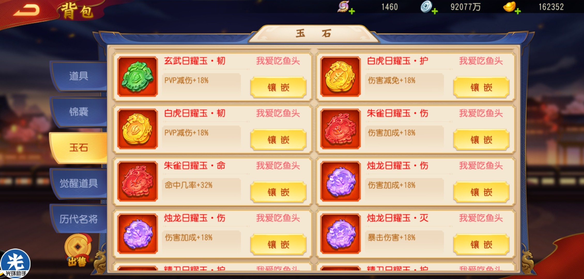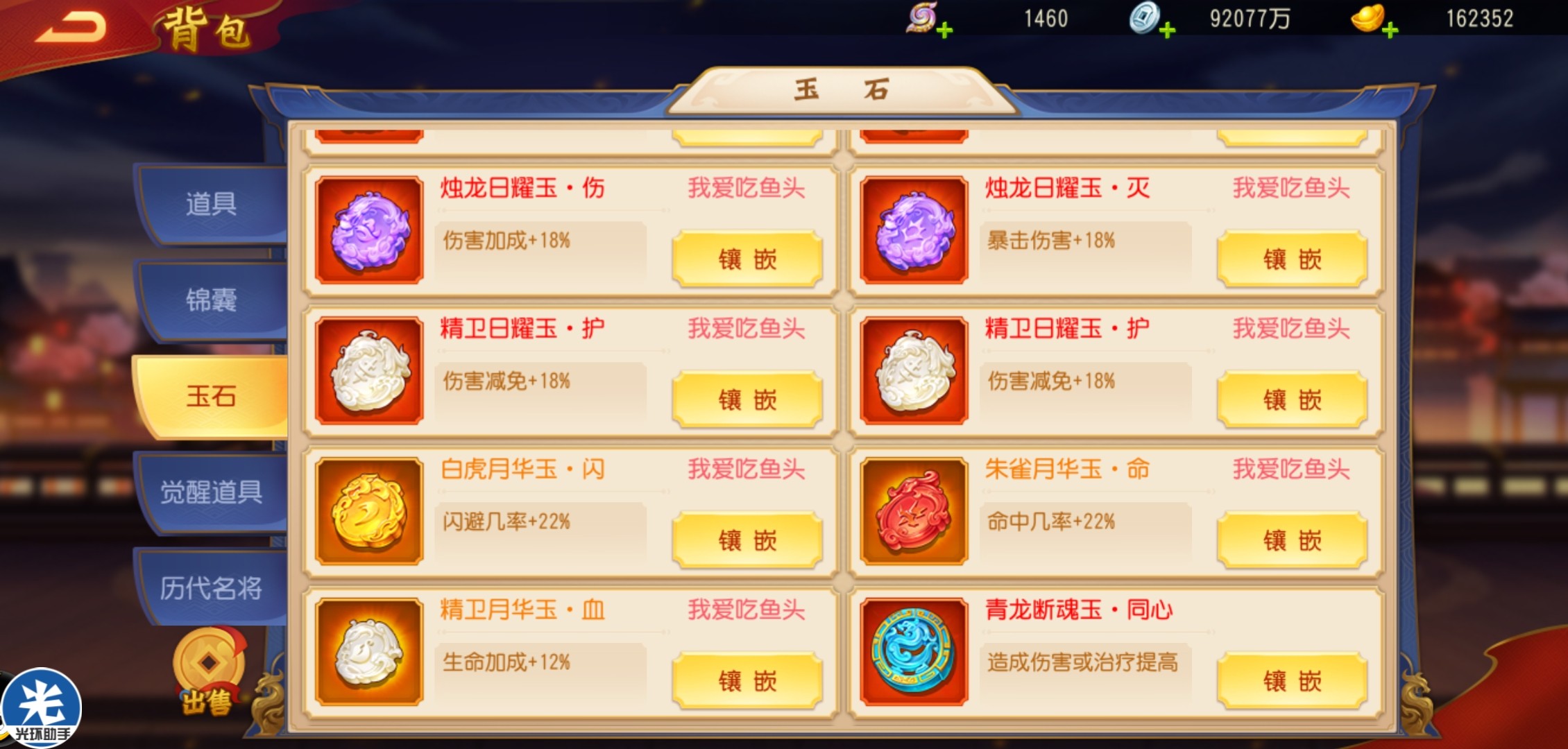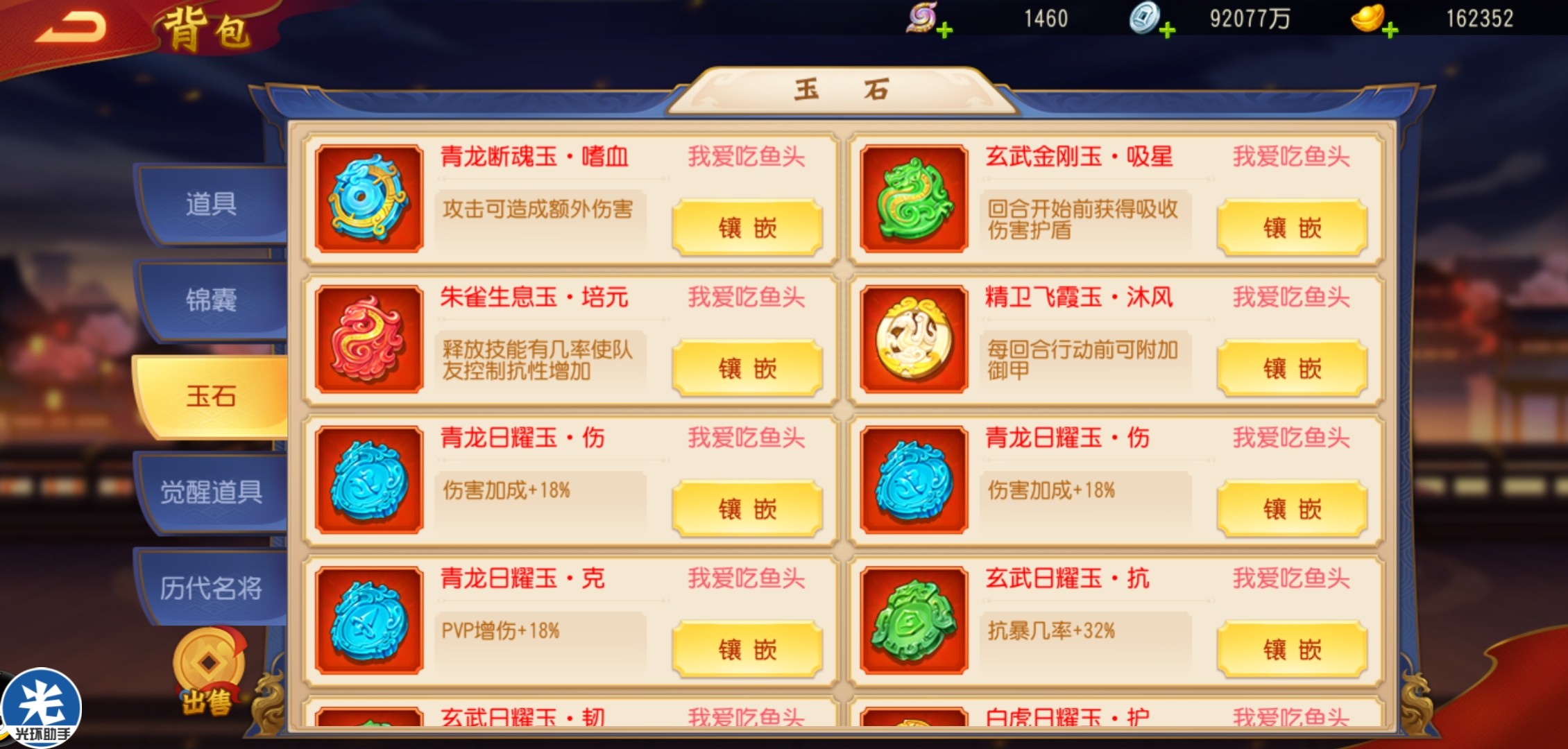 至今鱼头还没有第二套玉石,比如嗜血、追魂、化雨、化伤等,所以二核输出一直都不能上阵。