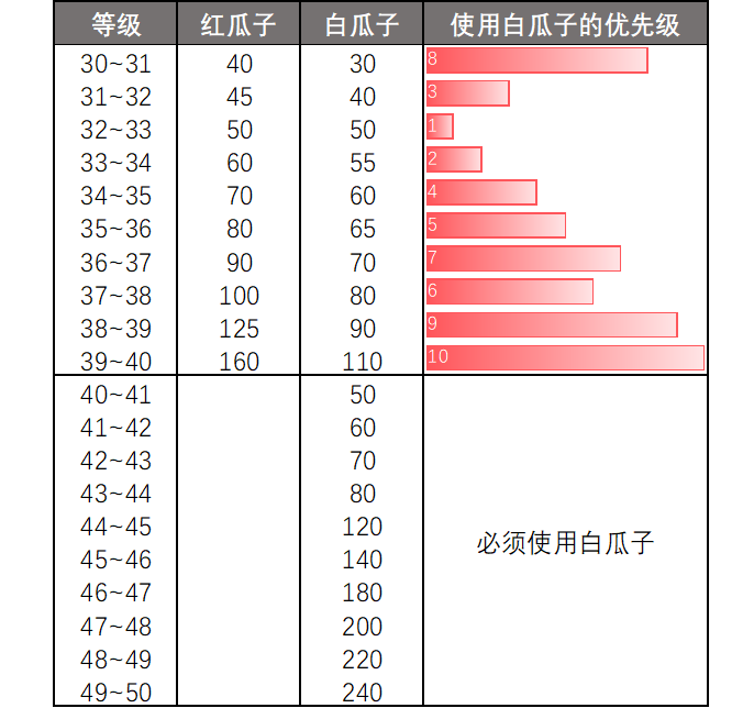 无论如何都是使用红瓜子更合适,但免费玩家又很少需要升级40以上,也就是说获得的白瓜子完全可以大部分用来升级30到40观察下面的礼包图可以大概得出白瓜子是红瓜子价值的1.66倍(免费玩家与付费玩家新系统性价比不同是老传统了,猜测后续还会降一些,接近1.5倍甚至更低)对付费玩家,30到40阶段同样是无论如何都是使用红瓜子更合适