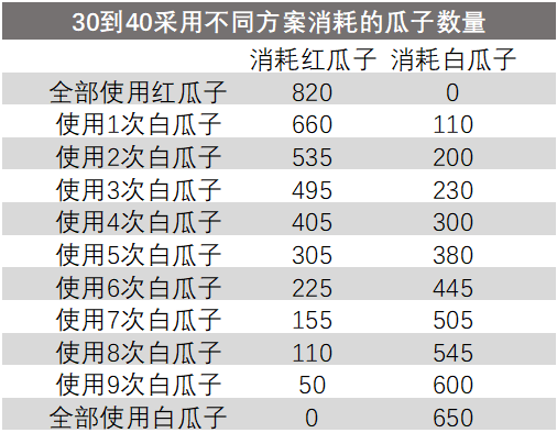 总消耗红瓜子2025,白瓜子2050,升级5名英雄到42专,只在30、36、38、39、40、41级别升级时使用白瓜子总消耗红瓜子1220,白瓜子2240,升级4名英雄到42专,只在30、36、37、38、39、40、41级别升级时使用白瓜子如果一个英雄30到40专使用数次白瓜子,优先在哪次升级使用↑