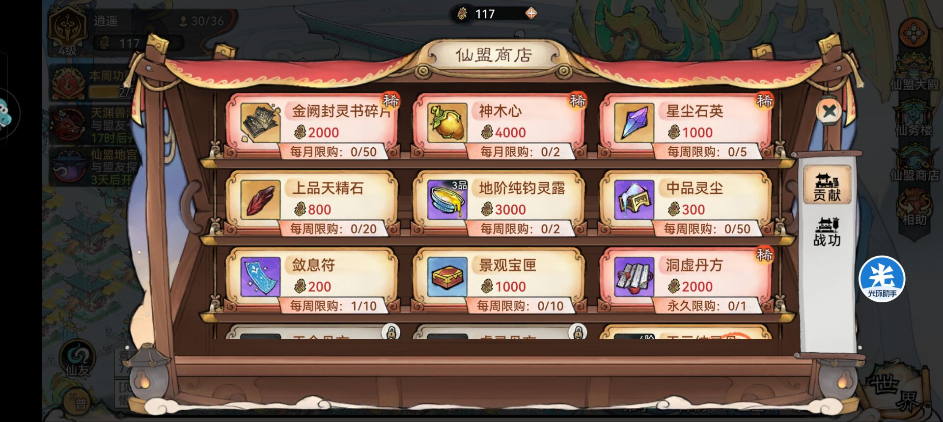 ②然后记得去仙盟提交灵玉,获得大量的仙盟贡献,第六天的仙盟商店刷新了2个新物品:【神木心】和【纯钧灵露】这2个物品暂时先观望,不兑换。因为兑换需求的贡献值很高。