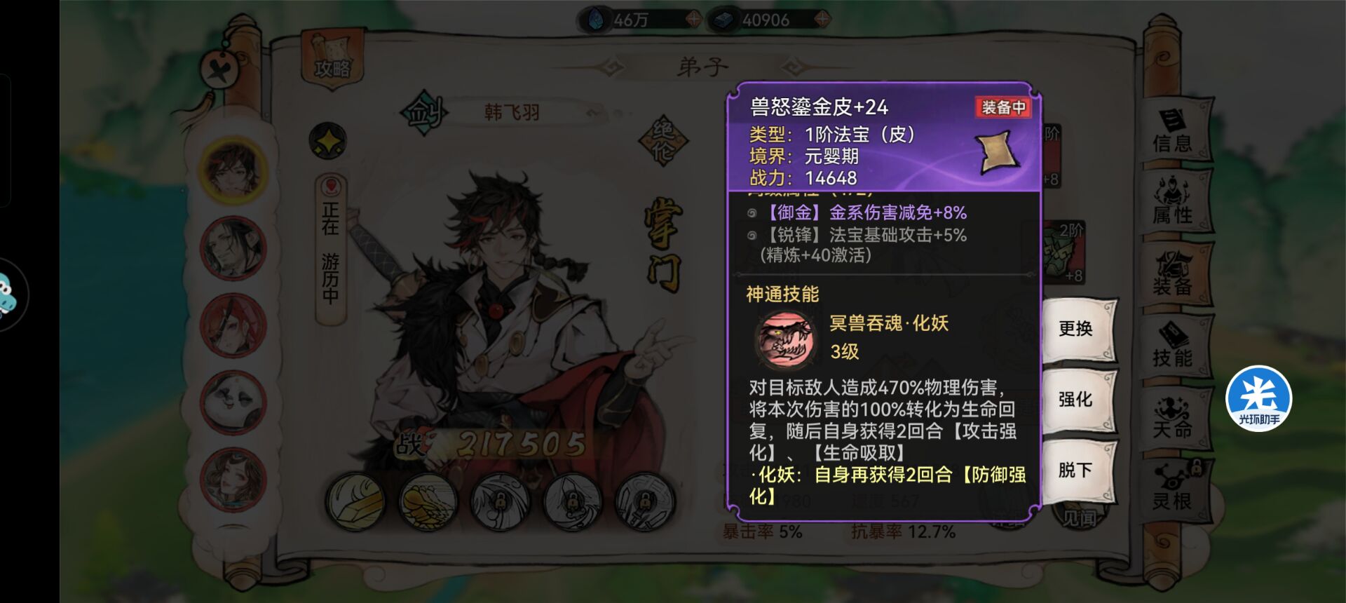 ⑤弟子总战力:69万+。宗门等级20级。昨天晚上也是顺利把第一大肉盾【元润】给兑换了出来,非常开心^_^!!!