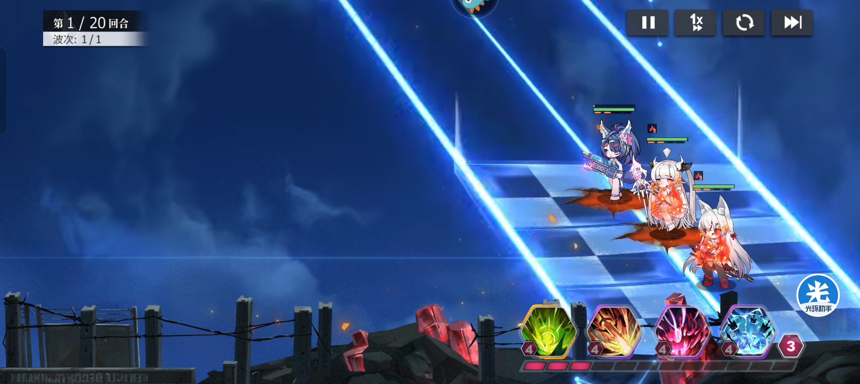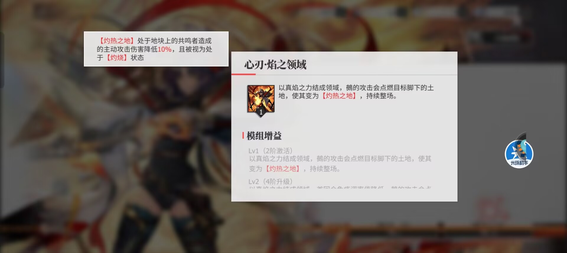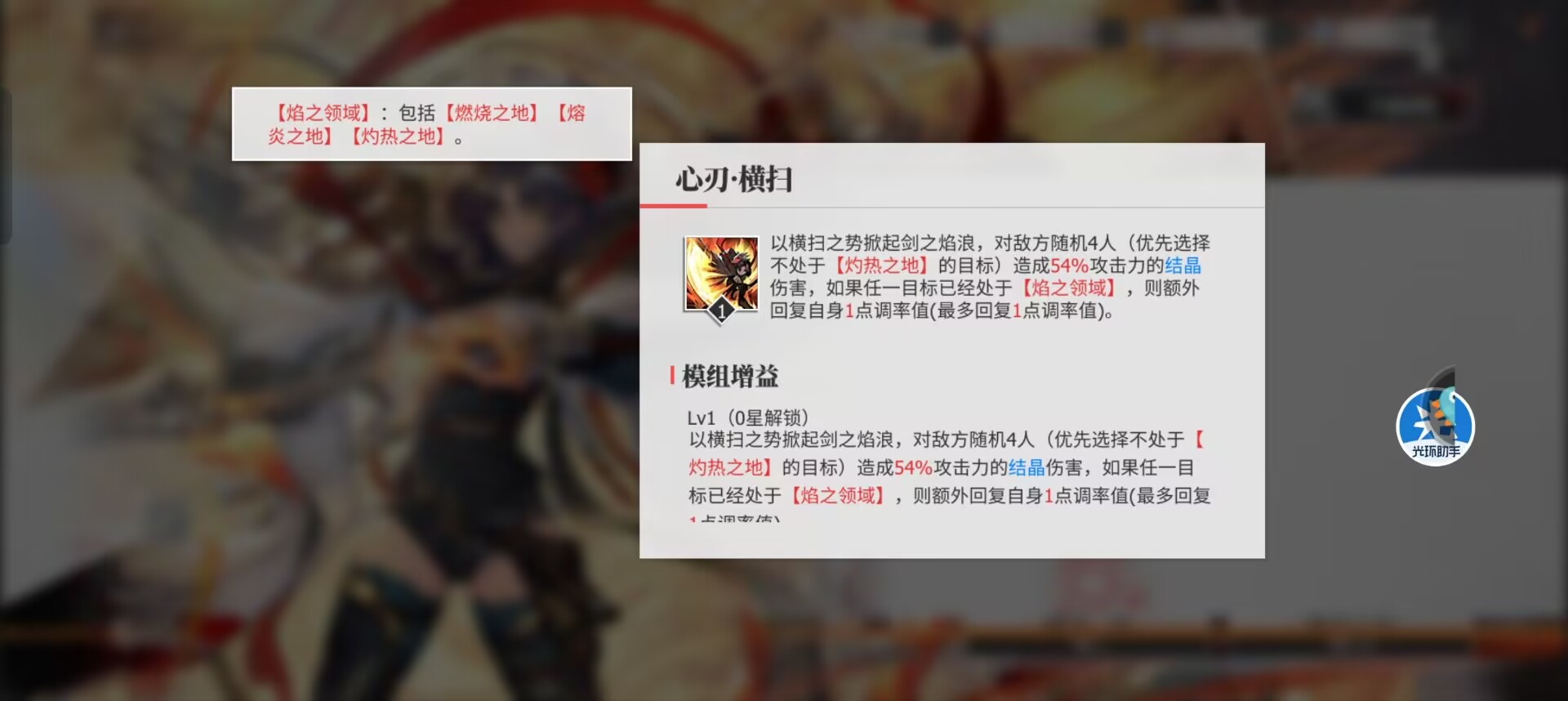 ①1技能为:【心刃–横扫】。优先选择没有【灼热之地】的敌方随机四个目标造成伤害,如果该技能命中带有【焰之领域】的目标。则自身回复1点调律值。