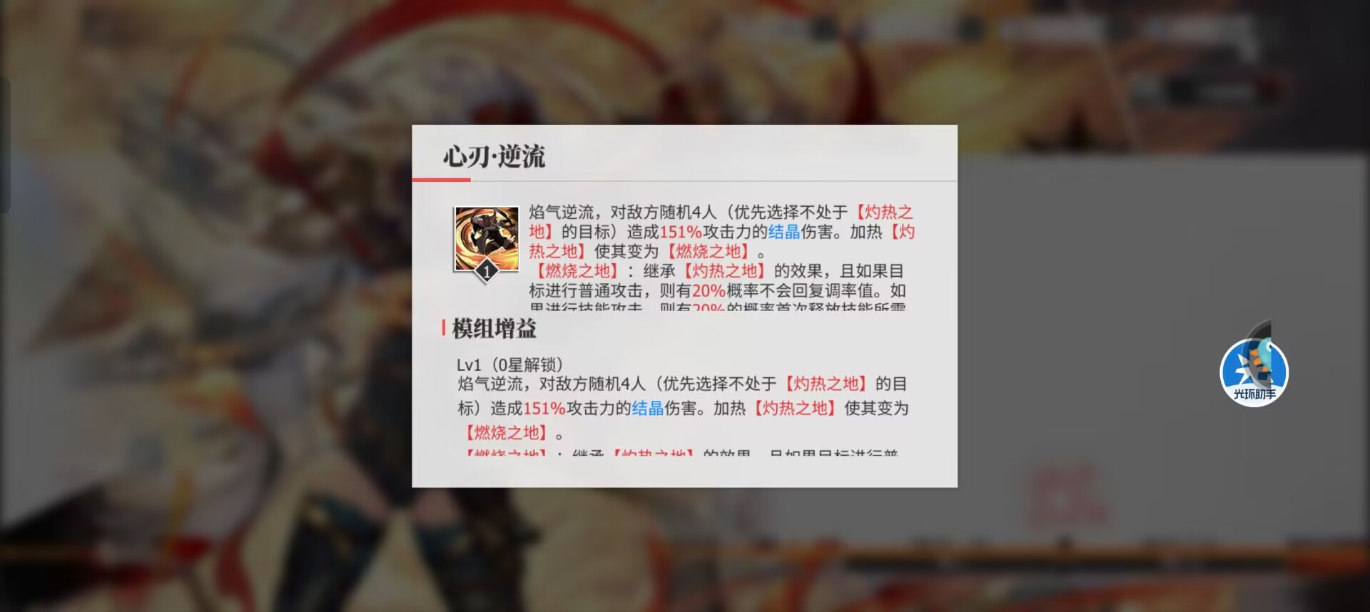 ②二技能为:【心刃–逆流】。也是优先选择没有带【灼热之地】的4名随机敌人造成伤害,同时加热【灼热之地】转换为【燃烧之地】。