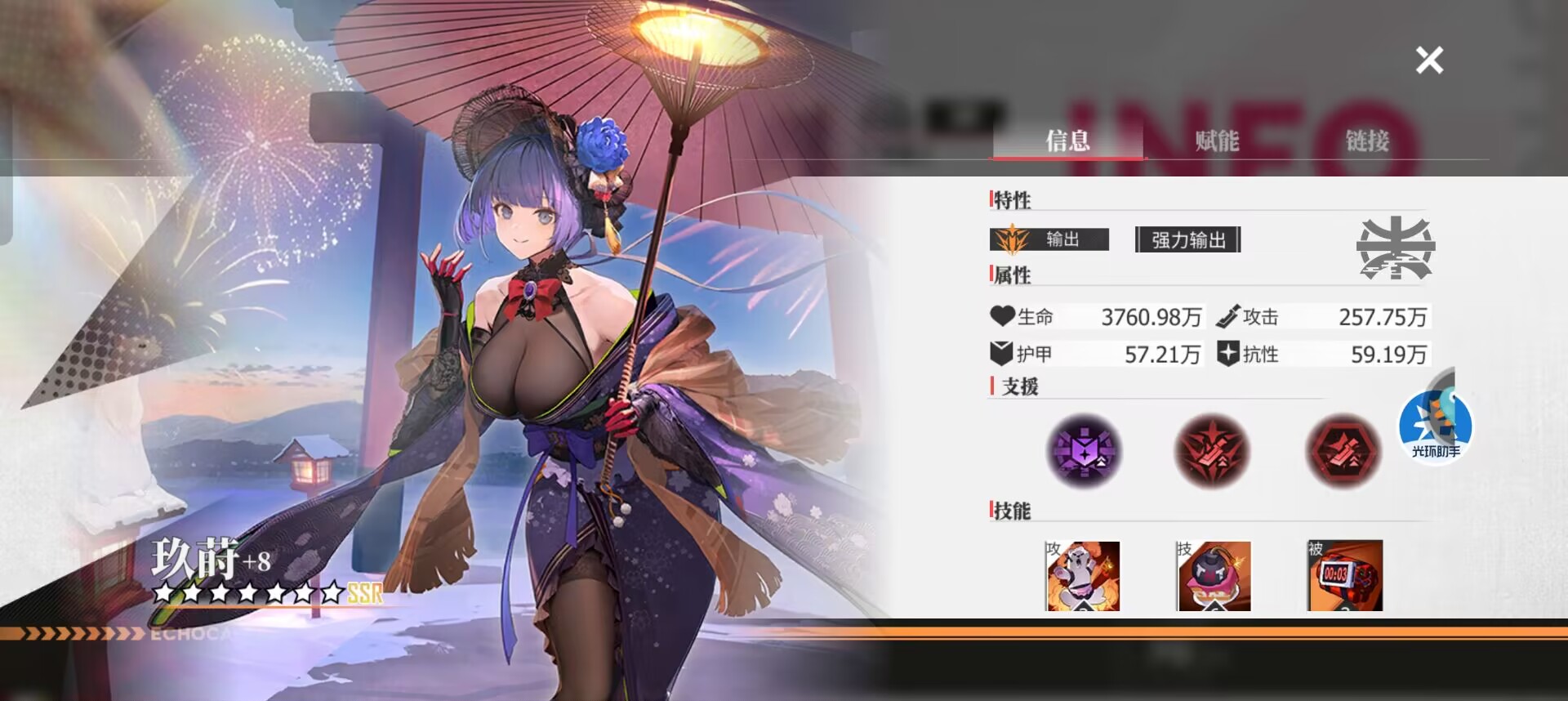 同时也是搭配【玖莳】的最佳搭配,能够提升玖莳的伤害加快玖莳的伤害启动速度。
