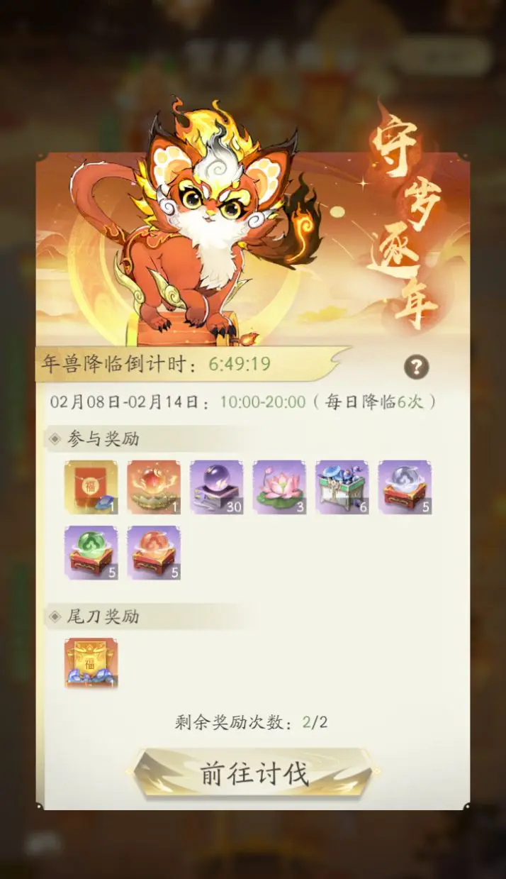 1.每日可讨伐年兽2次,次数用完将于次日5:00刷新;