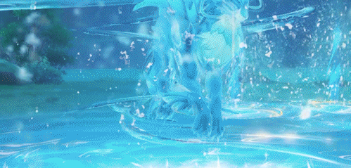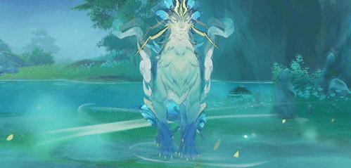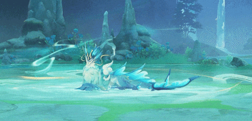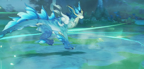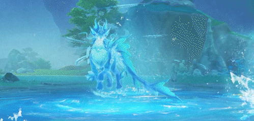 猊兽侧持尾虹光,遽引身倒转,导引出清界水刀,又再复一次。水刃造成80%攻击力的水元素伤害并击退玩家。动作很缓慢,若此时又冰附着则减速非常明显