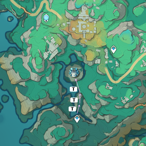 传送至赤璋城垣南部的锚点(悬练山西北)处锚点(此图最下方的锚点),往小地图北的方向平视即可发现一簇「金鲤浮跃」,向前一共有3簇(图中箭尾箭头交接处即为),利用其即可到达猊兽处:「金鲤浮跃」:浮于空中的水珠,对其按T键交互即可传送并停留在上面(不能换队伍),此时可以选择方向发射自己(会自动开启风之翼),可以理解为璃月四叶印,但是更高级了。