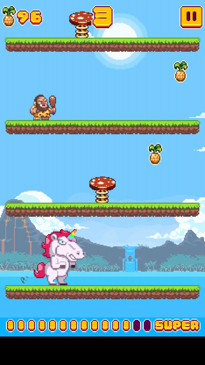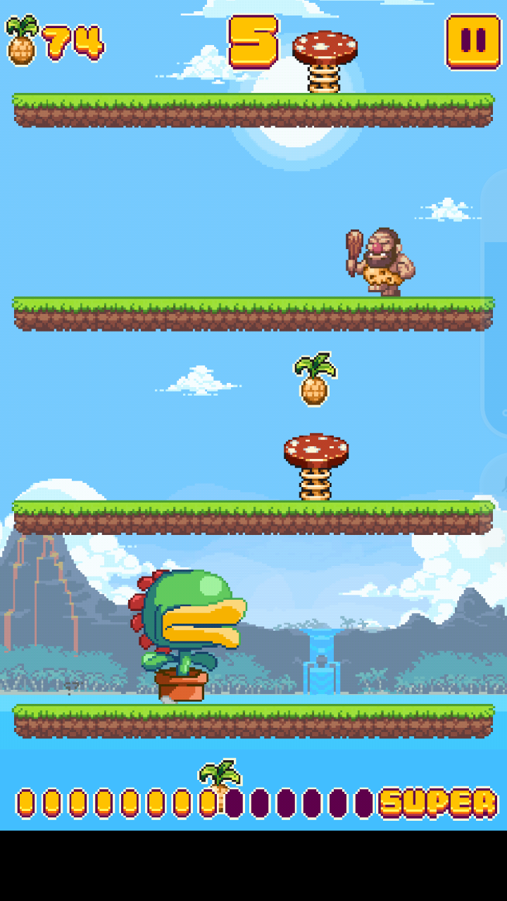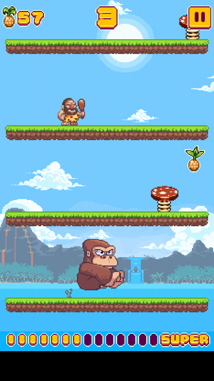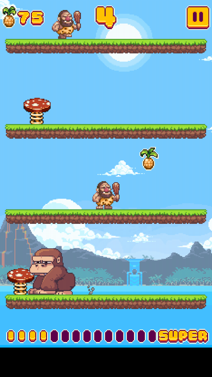 别看游戏简单,可操作这方面可是非常需要技术含量的。玩家能控制的只有动物的两段跳跃,在没有原始人的地图上需要踩上会弹跳的蘑菇才能顺利到达下一层,否则只会撞晕在地上。别看前几层被撞晕的影响不大,待挑战到更高的层数后会出现狩猎的原始人,操作不当很有可能就会被原始人给抓走。
