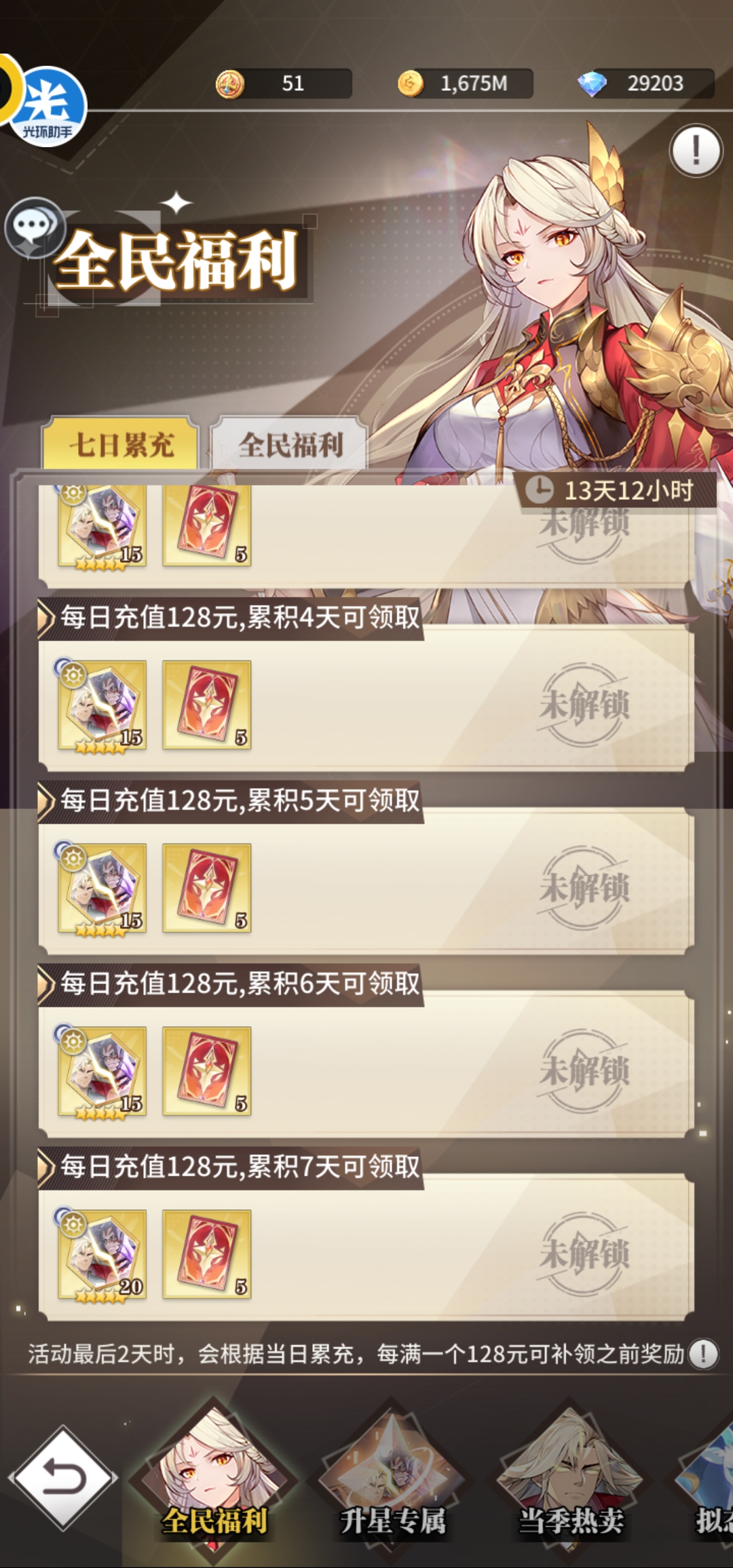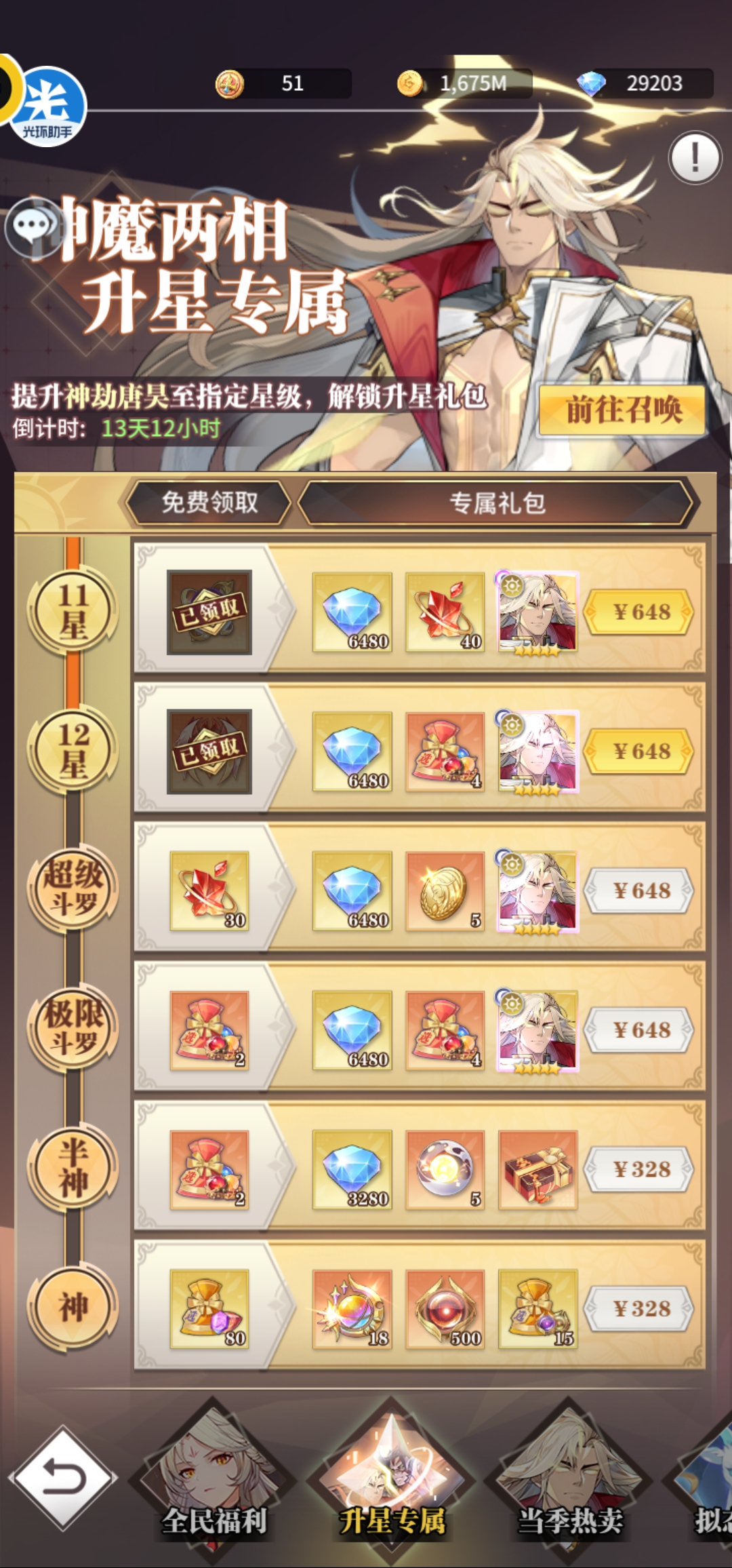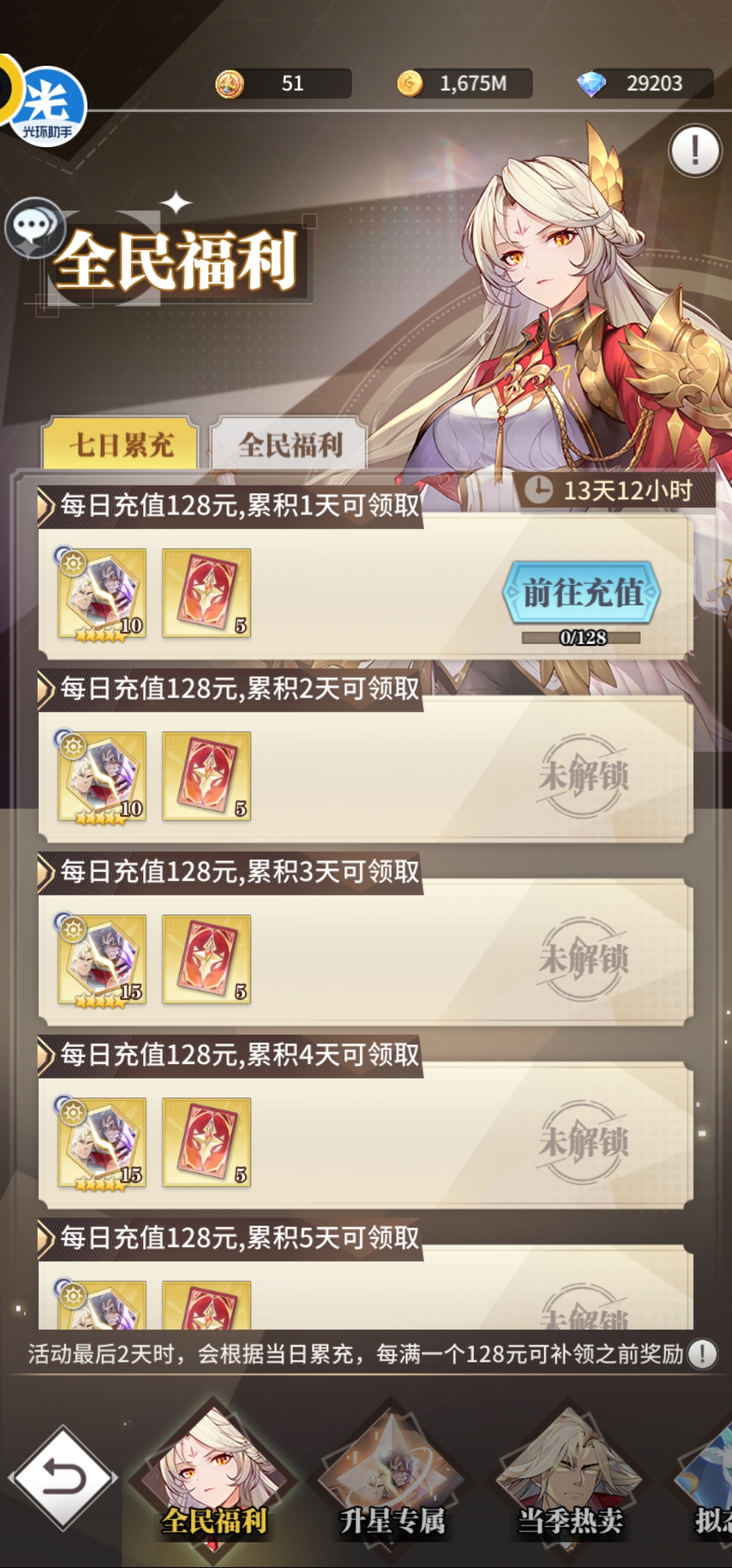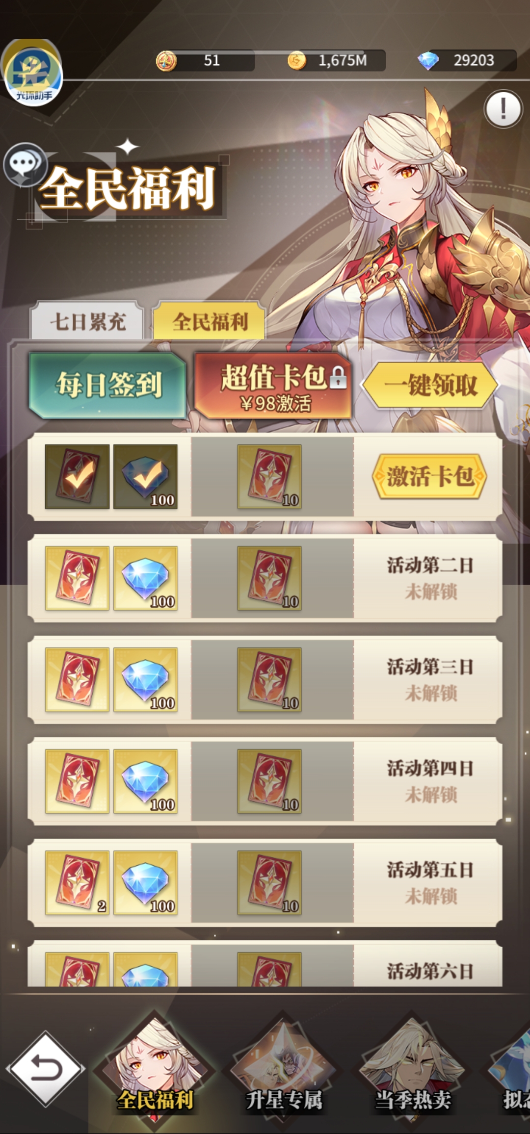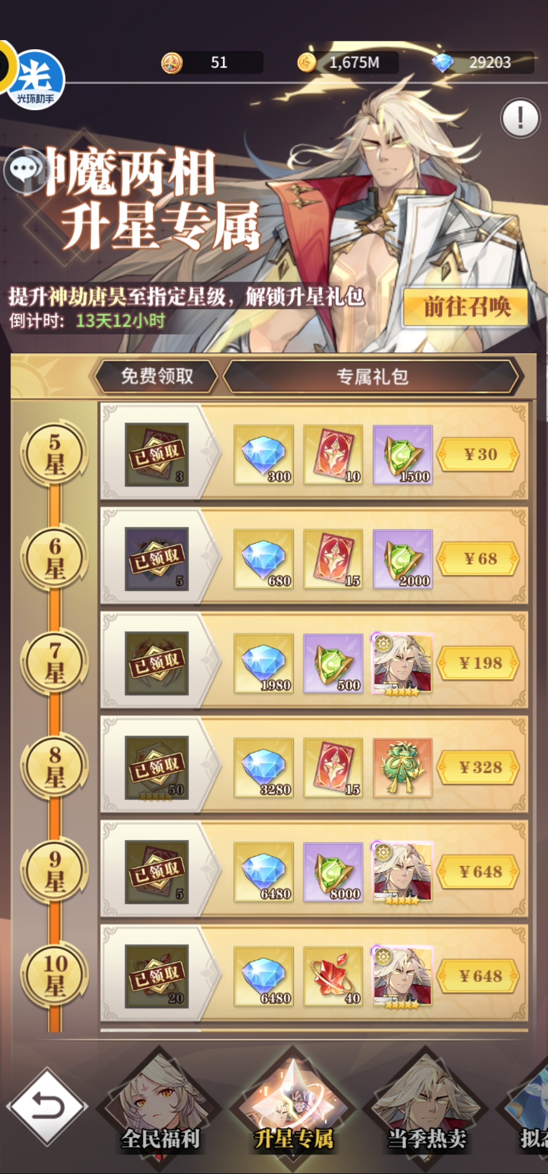 第一天超值卡包98元80限定契约+当季热卖30元10限定契约,第二天当季热卖68元+68元+6元共35限定契约,第三天当季热卖128元30限定契约,第四天升星68元+30元+月卡30元共25限定契约,第五天128元30限定契约,第六天128元30限定契约,第七天128元30限定契约+专属升7星198元+累充送35张限定契约。合计305限定契约花费1108元,基本可以获得2保底本体+抽卡送80碎片+每日累充100碎片,爱心等级拉满可得50碎片,专属7星50碎片,合计2张+1.6张+2张+1张+1张+1张=7.6张,再加上送的两三张,能够让神劫唐昊升到10星。这个阶段是性价比最高的充值方式。