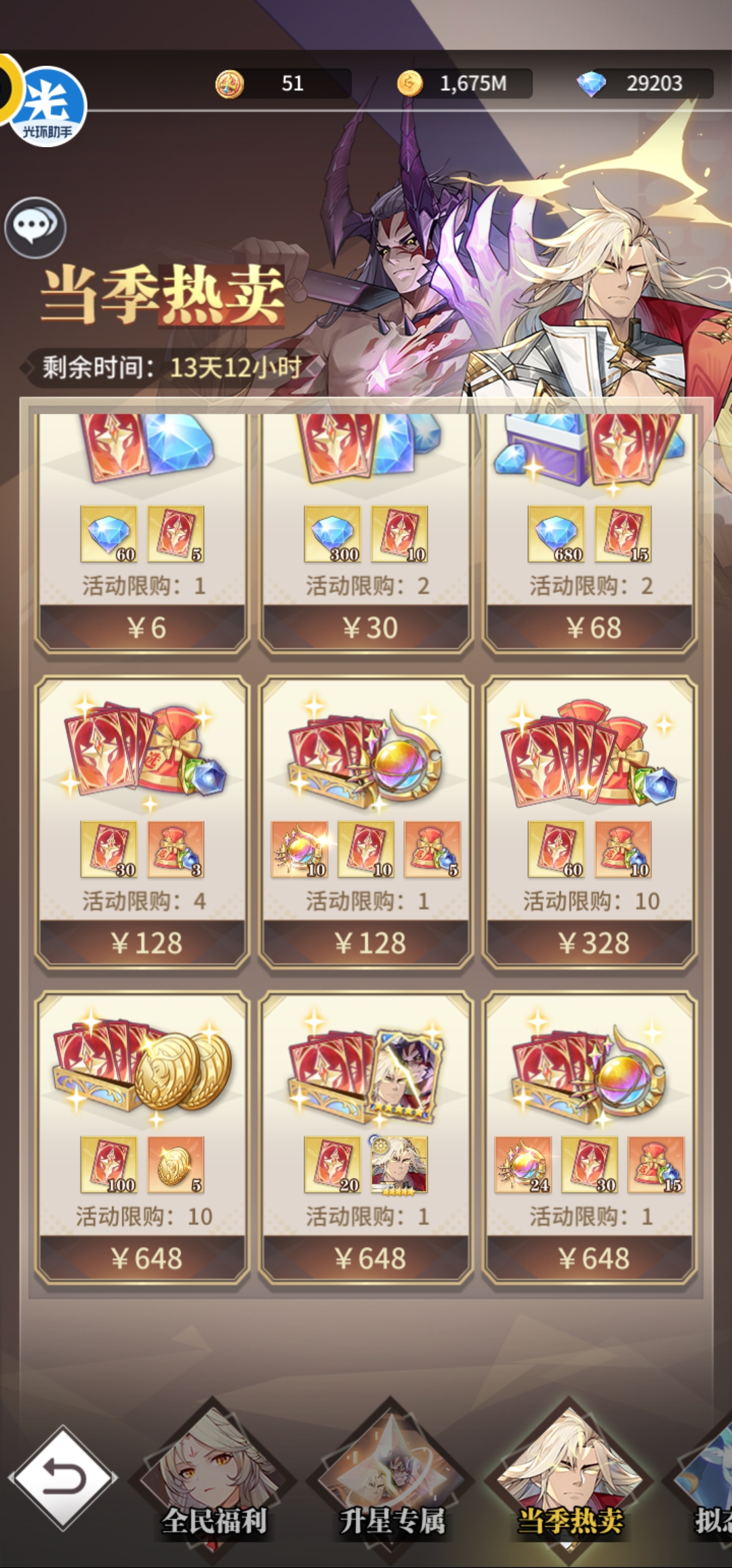 其他同上,第七天加注氪金,当季热卖648元获得1本体+20限定契约,当季热卖648元100抽+当季热卖328元*10有600限定契约,加上前面300抽,共花费5596元,合计1020抽,8.6张+2.4张+1张+5张(700抽卡,只要不是大非酋)=16张,可以选择继续加注购买升星专属9星10星11星12星极限648元*4=获得4张本体多96抽+当季热卖648*2获得200抽+10祈祷币,加上送的两三张,16+4+2+2/3=24/25张本体成神,共计花销9484元,当然实际费用更低,因为这算是按照保底计算。