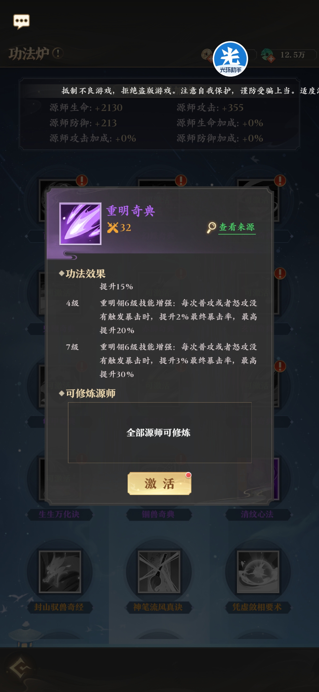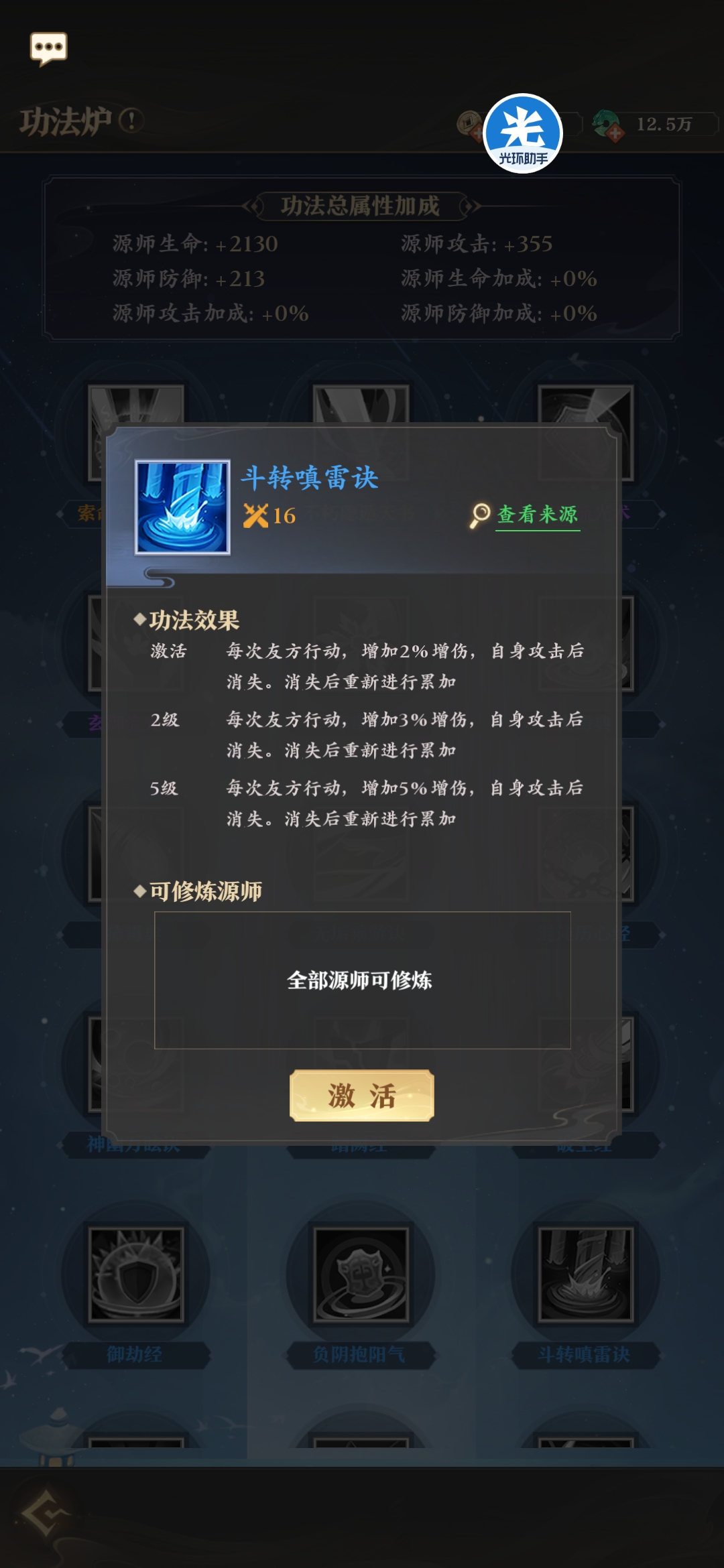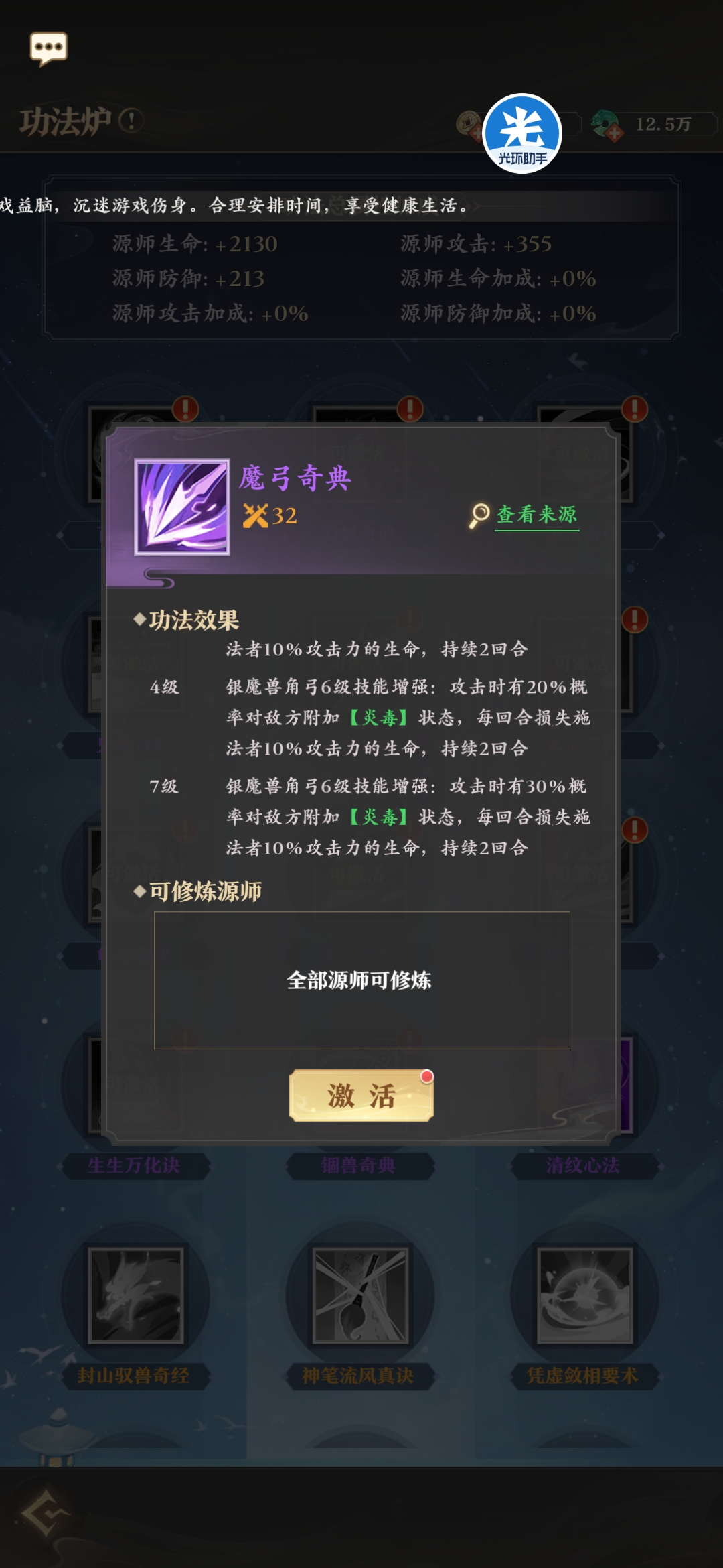 非常实用的功法,无论任何情况都能触发其中一种效果,血量少加血,血量高增伤,每回合都能触发,输出源师有格子的带一个肯定没问题。