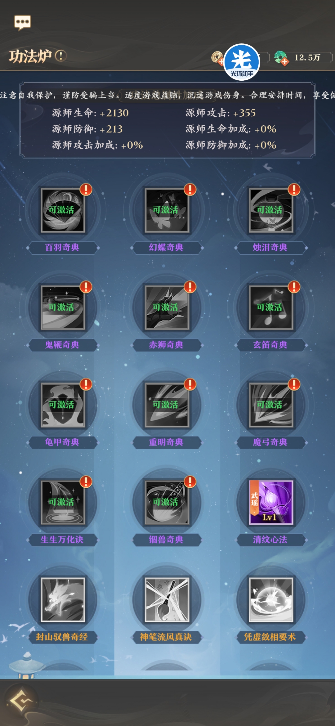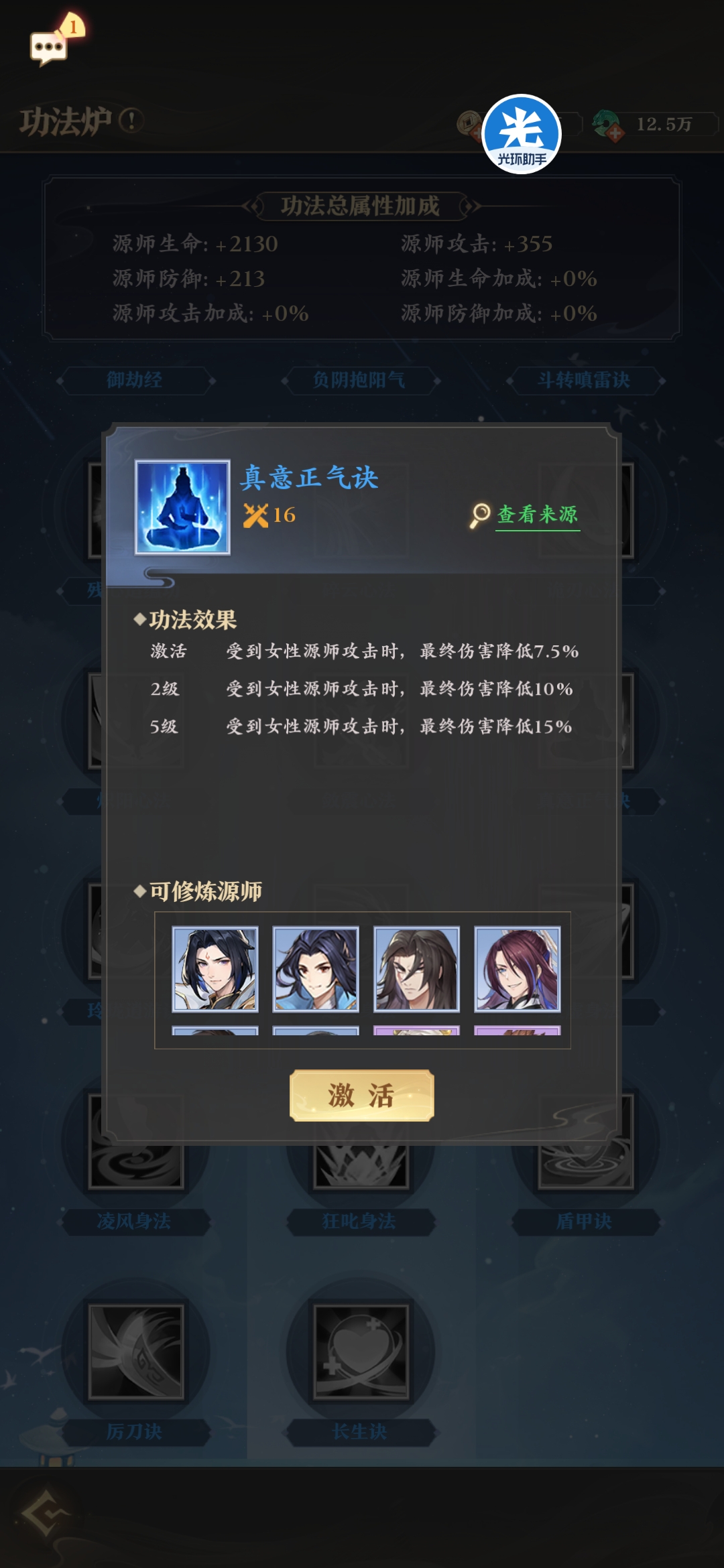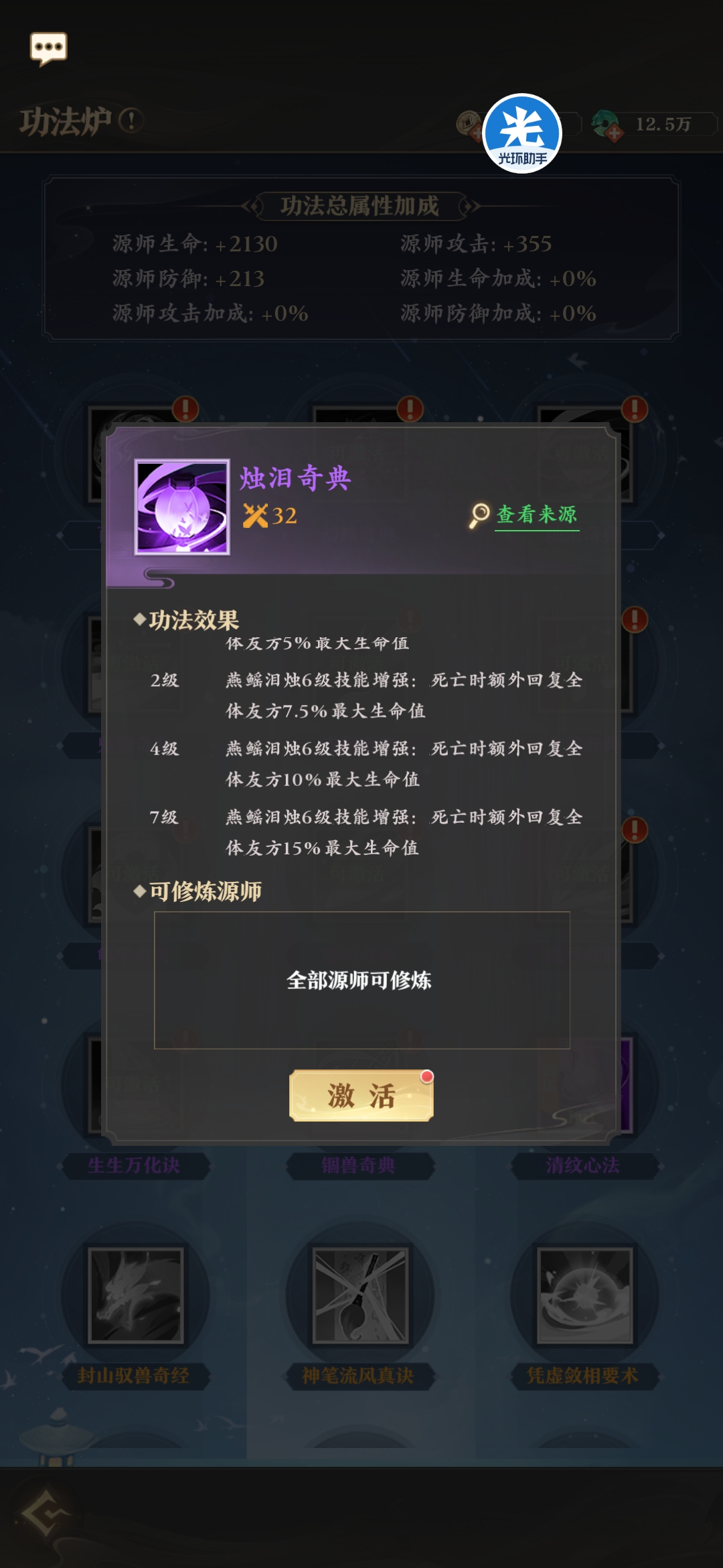 非常实用的功法,无论任何情况都能触发其中一种效果,血量少加血,血量高增伤,每回合都能触发,输出源师有格子的带一个肯定没问题。