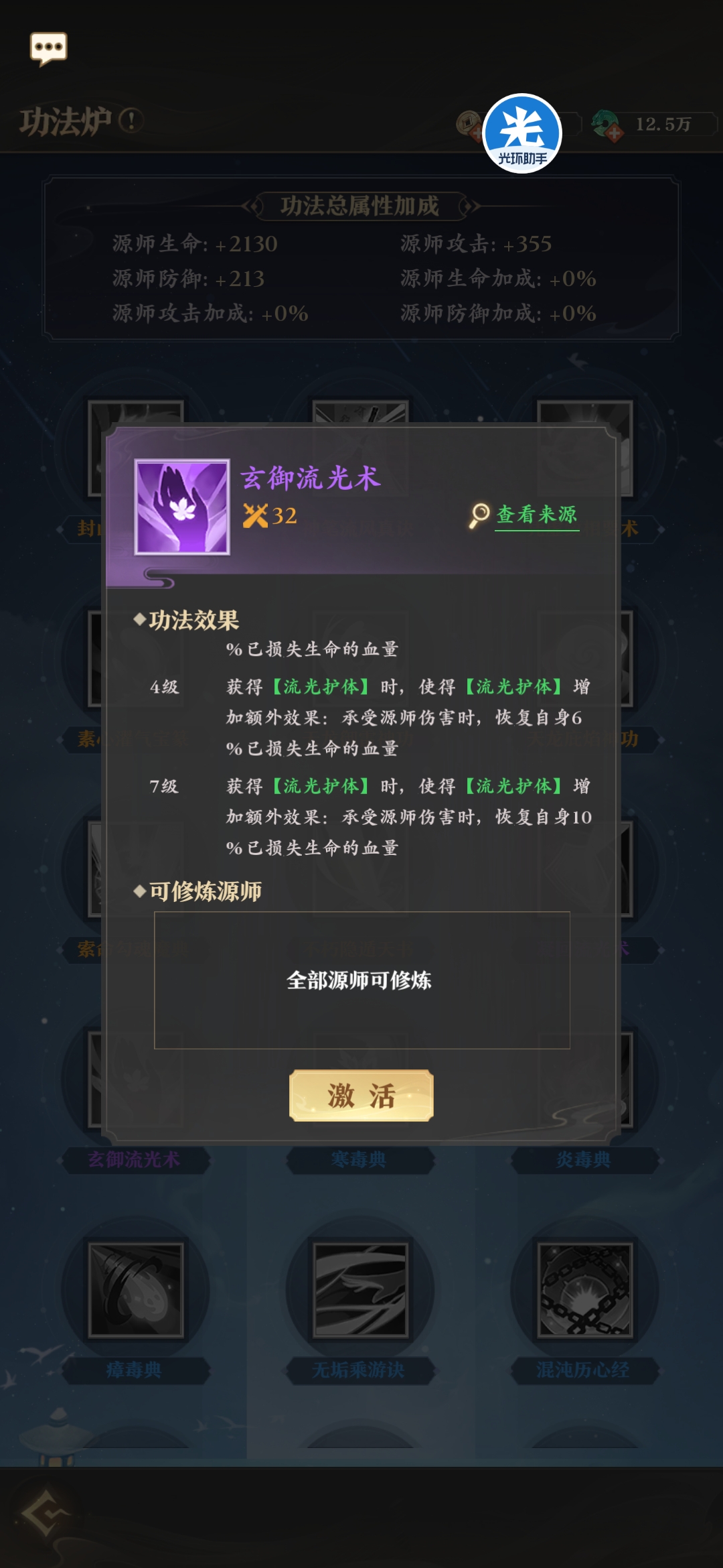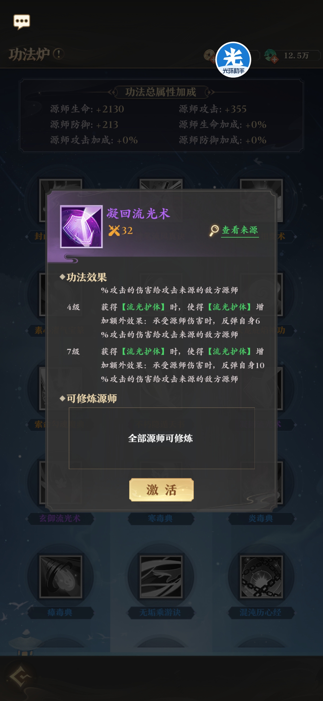 满级效果:获得【流光护体】时,额外获得反伤效果。被源师攻击时,反弹10%自身攻击伤害。