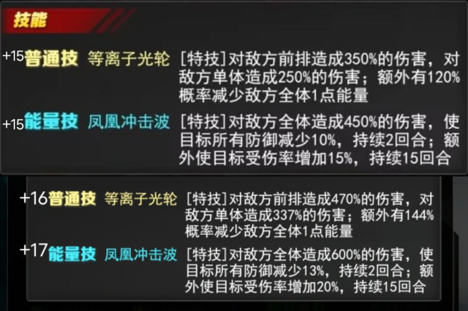 -15能量技 凤凰冲击波[特技]对敌方全体造成450%的伤害,使目标所有防御减少10%,持续2回合;额