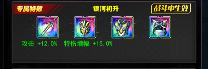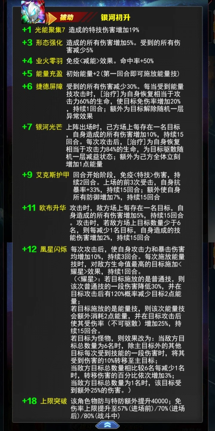 +7 银河光芒 上阵出场时,己方场上每存在一名目标自身造成的所有伤害增加10%,持续15