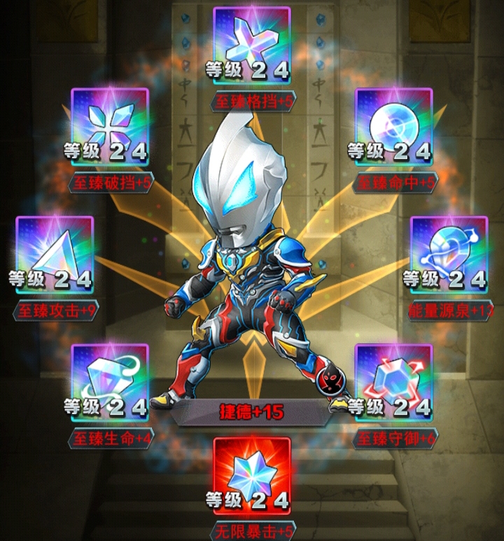 寄宿着银河、艾克斯、欧布力量的奥特勋章,赋予了捷德全新的力量,一举使用必杀技「凤凰冲击波」溃败吉尔巴里斯。解决了泽塔所在地球的危机后,小陆继续踏上了消除「恶魔碎片」的旅途。