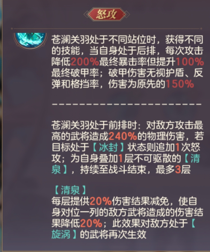 偶数时,释放魂技后可以和同列交换位置,这样的好处是一场战斗中苍澜关羽可以生效前后排两套技能组的效果,比较全面,缺点是稳定性较差