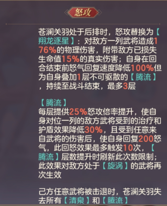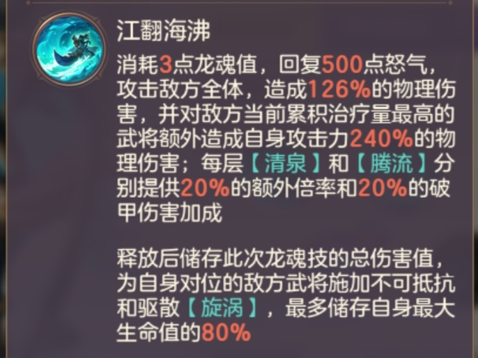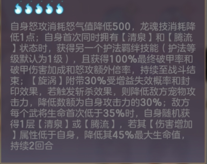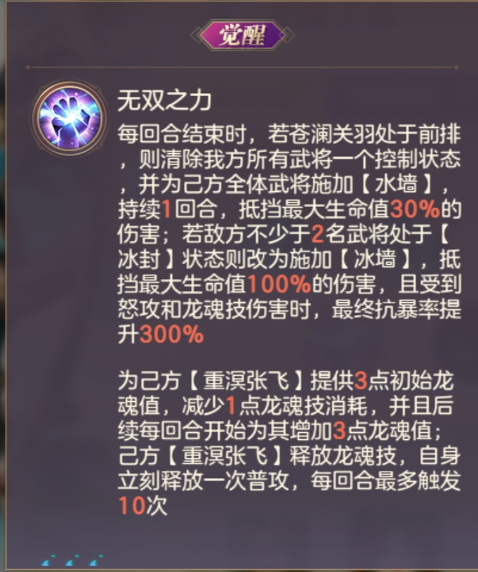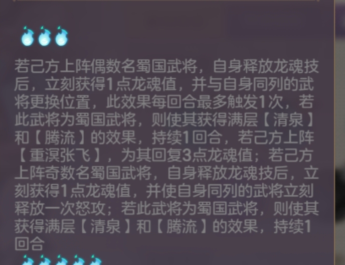 奇数时,释放龙魂技后同列武将追击一次怒攻,蜀国武将获得满【清泉】【腾流属性加成】