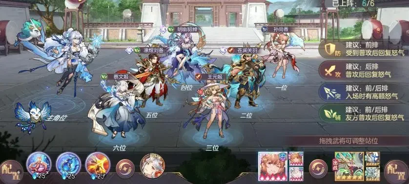 武将:孙尚香、王元姬、蔡文姬、苍澜关羽(关平护法)、明幽貂蝉(花鬘护法)、凛煜刘备(赵云护法)