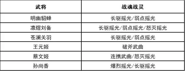 魂将:苍澜关羽0火启用(1、3、5火稳定提升,5火最佳)、明幽貂蝉0火启用(1、3、5火稳定提升,5火最佳)、凛煜刘备3火启用(5火最佳)
