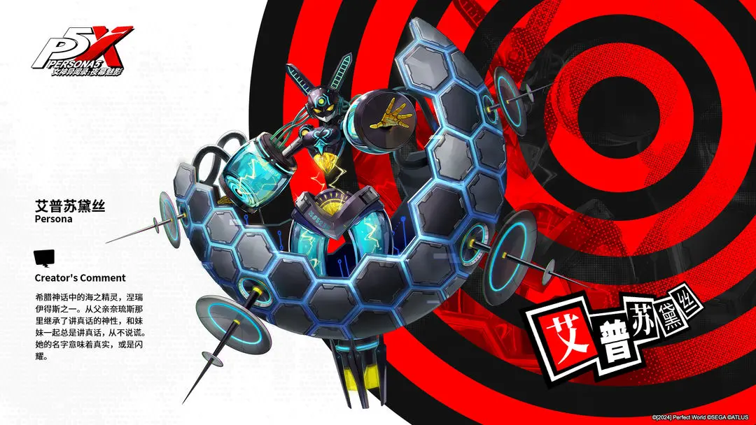 INDEX全书 | 人格面具 |『艾普苏黛丝』介绍女神异闻录:夜幕魅影 - 新闻星发布于 2024-02-13关注>>>PERSONA!『艾普苏黛丝』介绍 希腊神话中的海之精灵,涅瑞伊得斯之一。从父亲奈琉斯那里继承了讲真话的神性,和妹妹一起总是讲真话,从不说谎。她的名字意味着真实,或是闪耀。——冠以怪盗之名,夺回欲念之炎!——