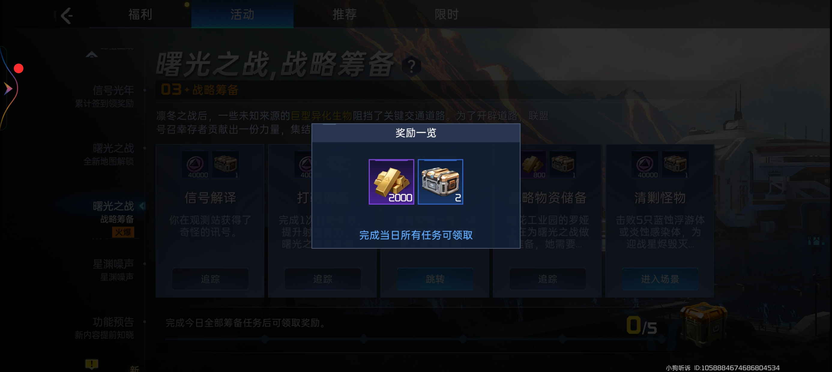一:【曙光之战】战略筹备。首先新版本前瞻的【曙光之战】还是和以前50级新版本的时候一样,全服玩家参加活动,然后打boss开放60级版本,这里每天的战略筹备任务一定要做,2000金条一定要拿,不拿白不拿。