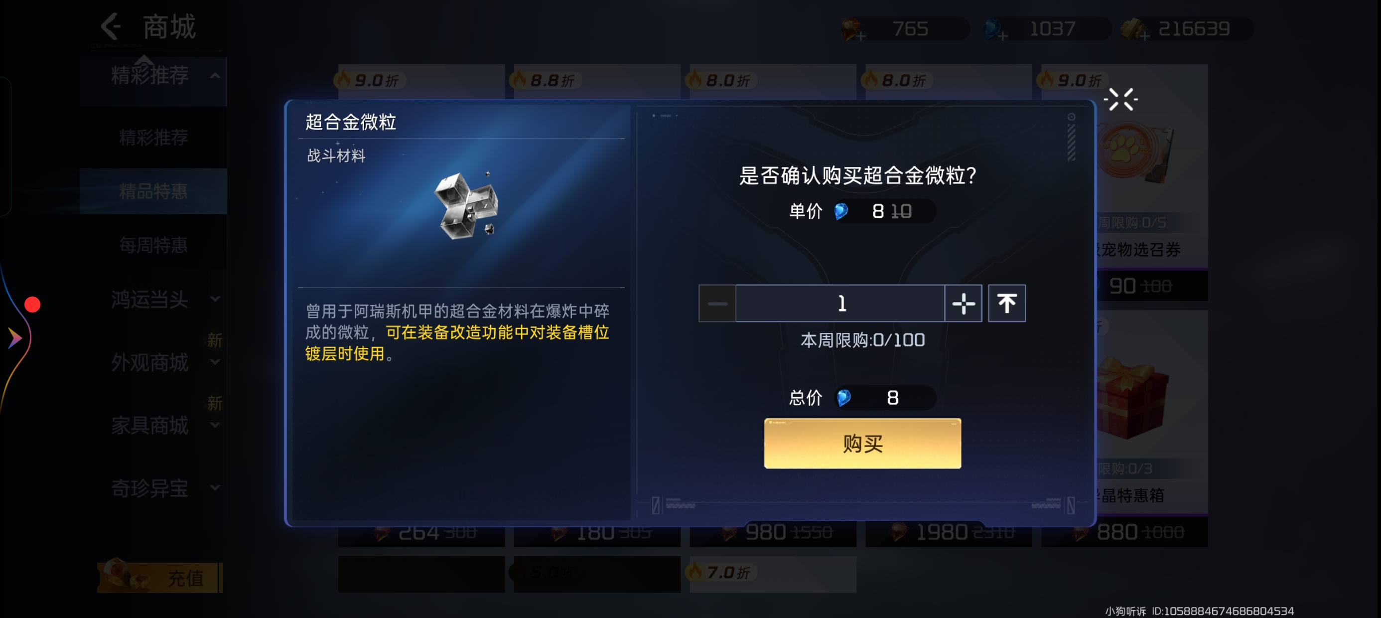 可以在商城精品特惠里面购买【超合金颗粒】因为有8折比较划算。