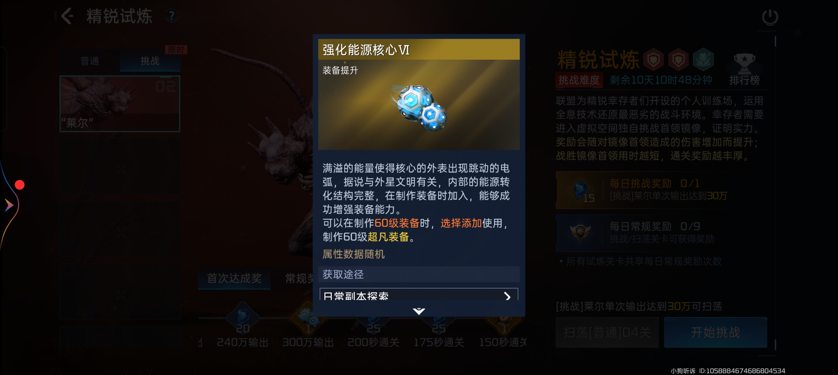 二:限时精锐试炼。这个精锐试炼是60级版本前送的福利,可以让我们优先获得一个60级的金色强化能源核心。