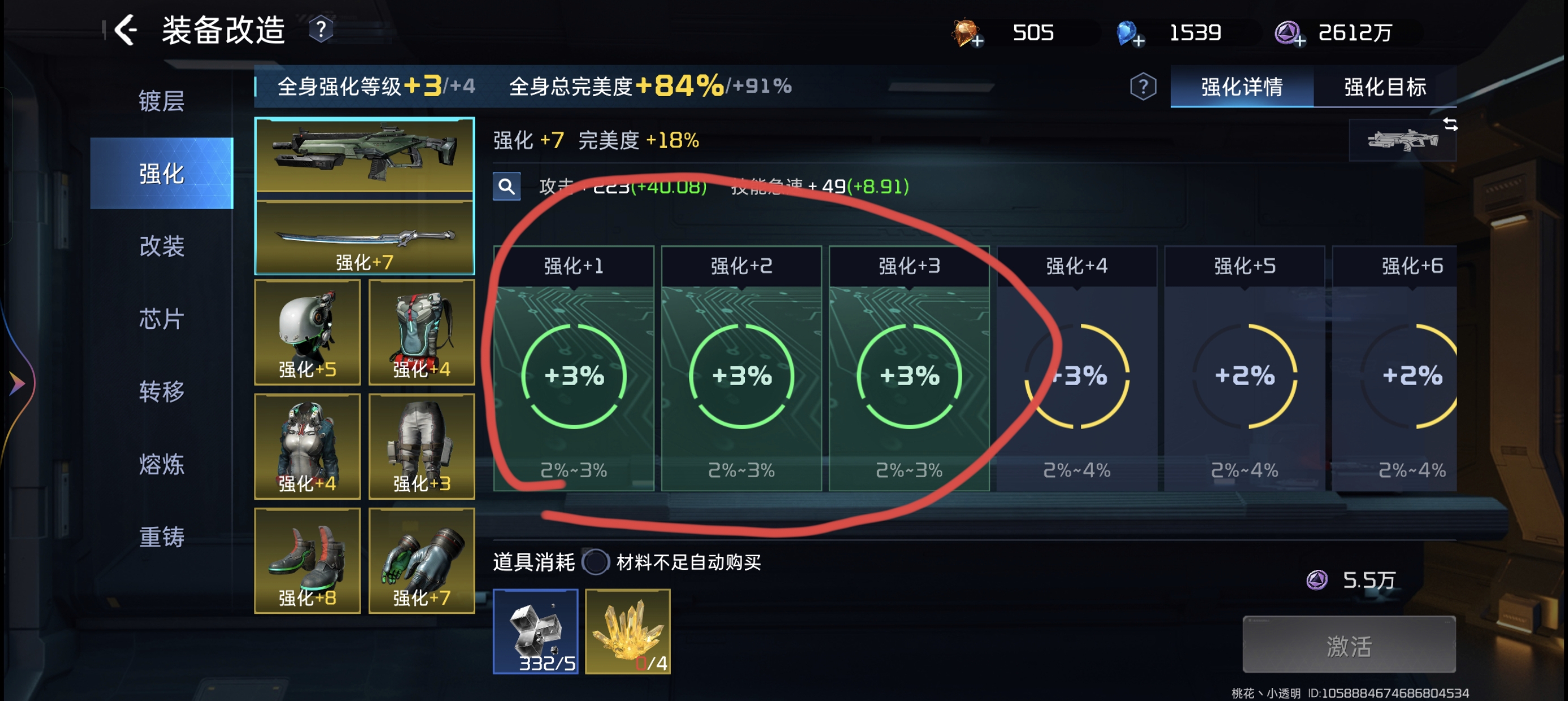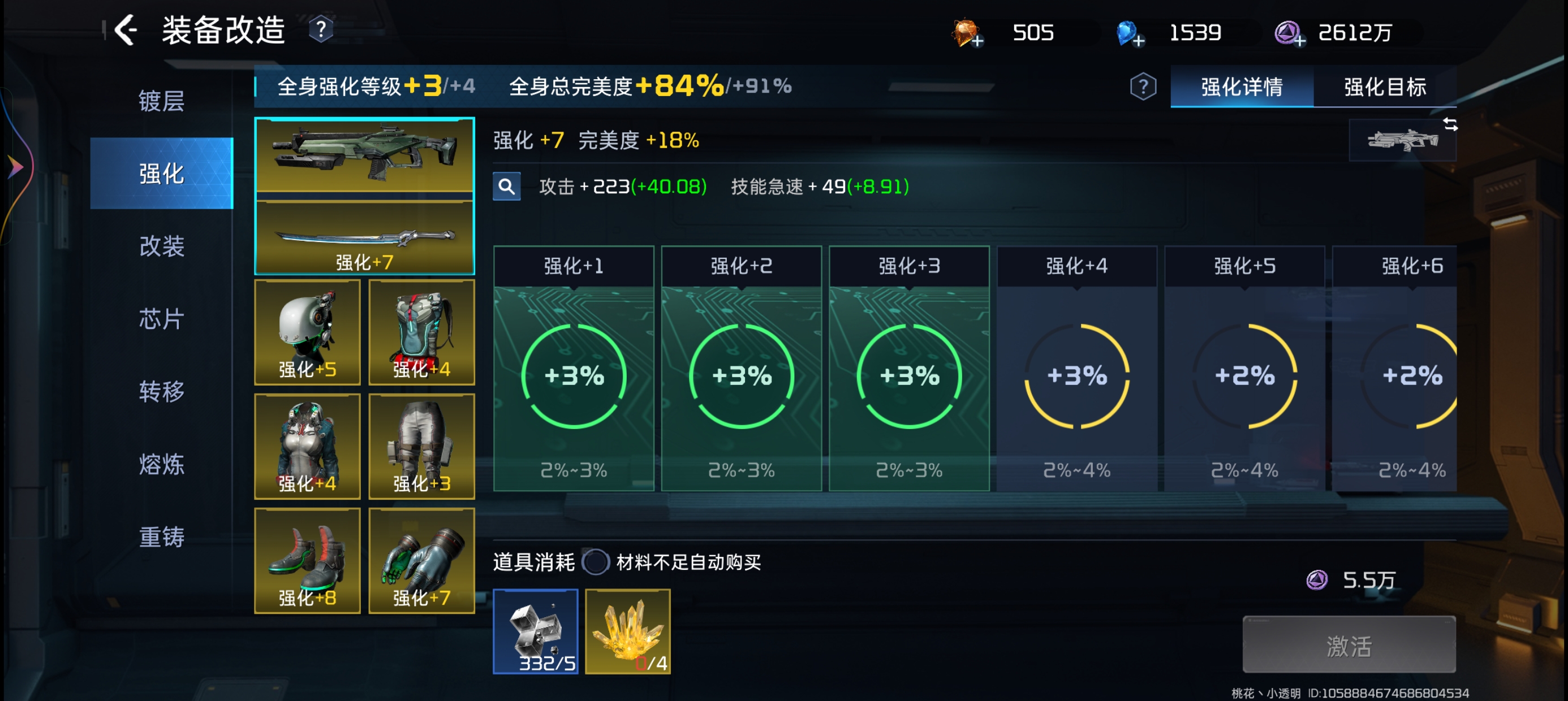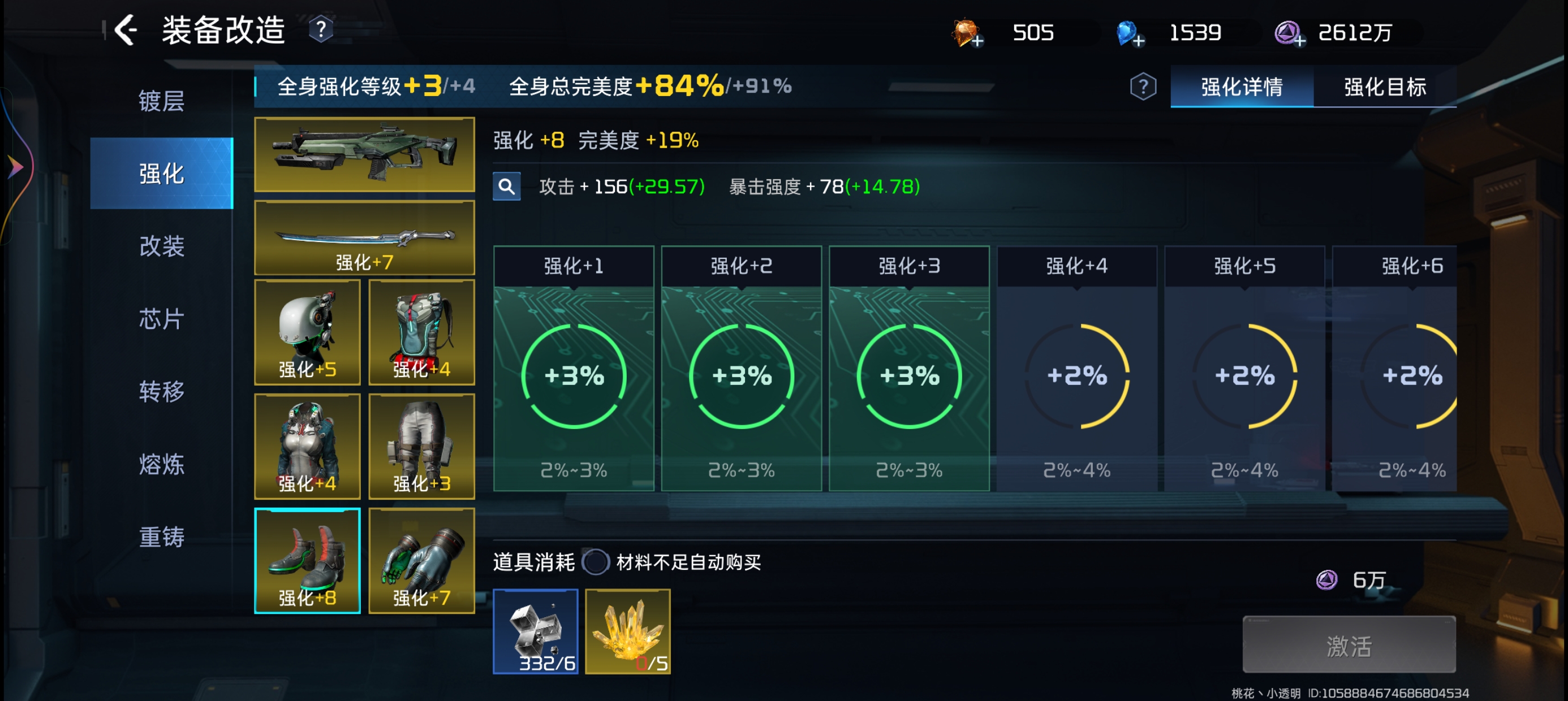 首先中氪以上的玩家,全身装备跟着等级走,然后每个部分最少都要激活强化+2%的加成。