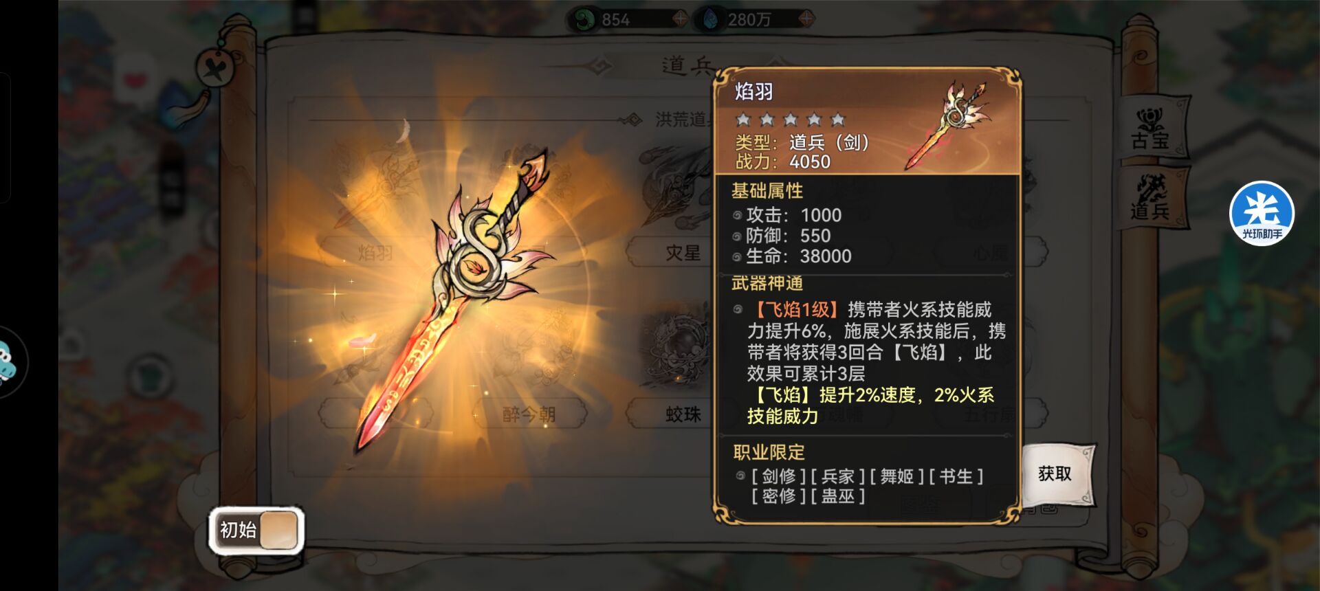 1:【焰羽】—搭配推荐。焰羽这把道兵效果是加强火系功法威力和速度,所以狮子认为最适合的职业是:剑修。