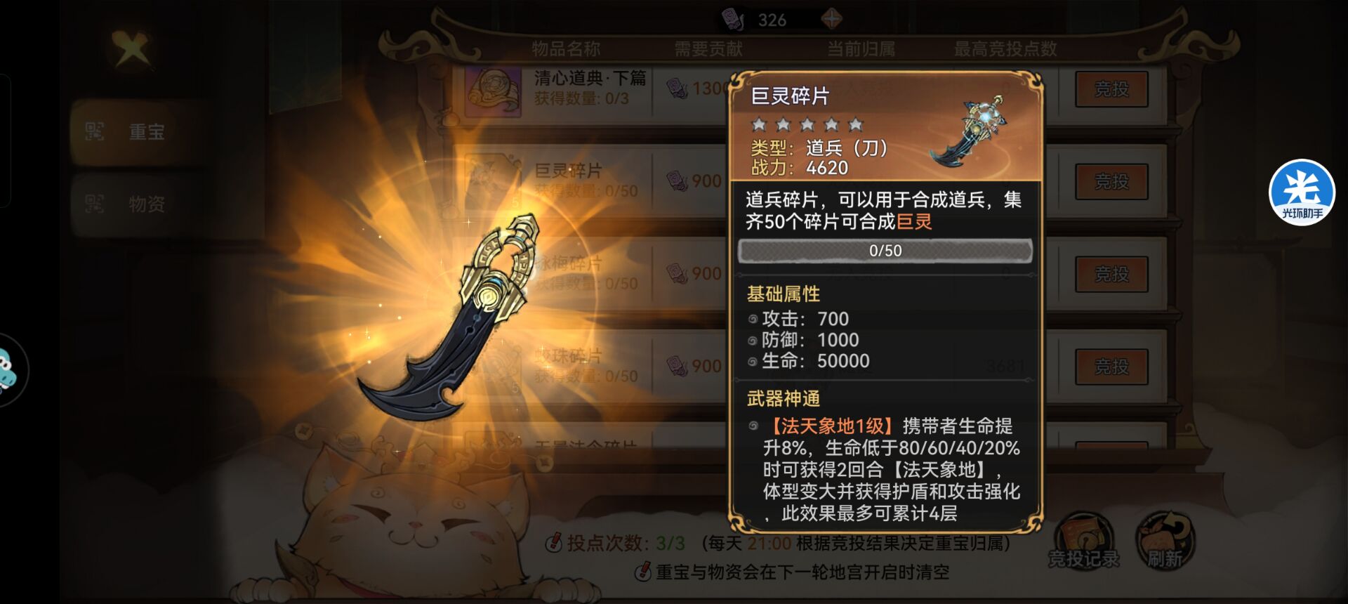 因为焰羽可以白嫖一把,剩下的3把最实用的就是巨灵,因为除了c位剑修,前排弟子禅修或者是兵家,就是我们优先考虑的对象,而巨灵这件道兵是非常符合前排的。