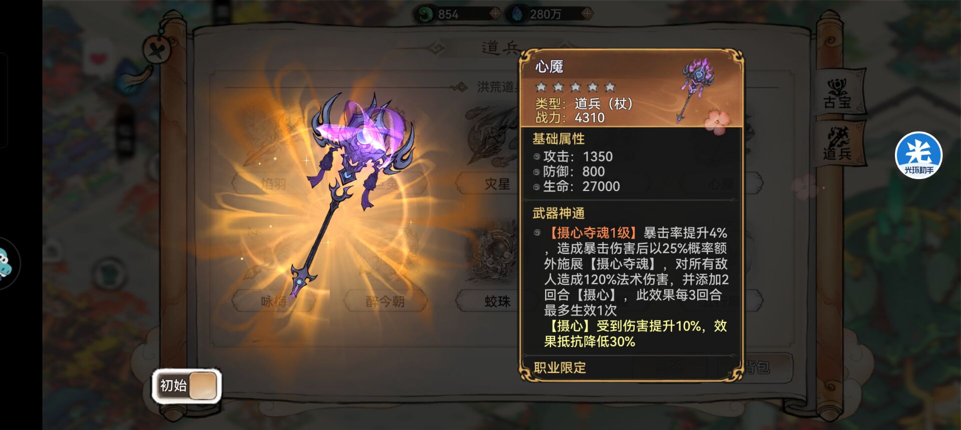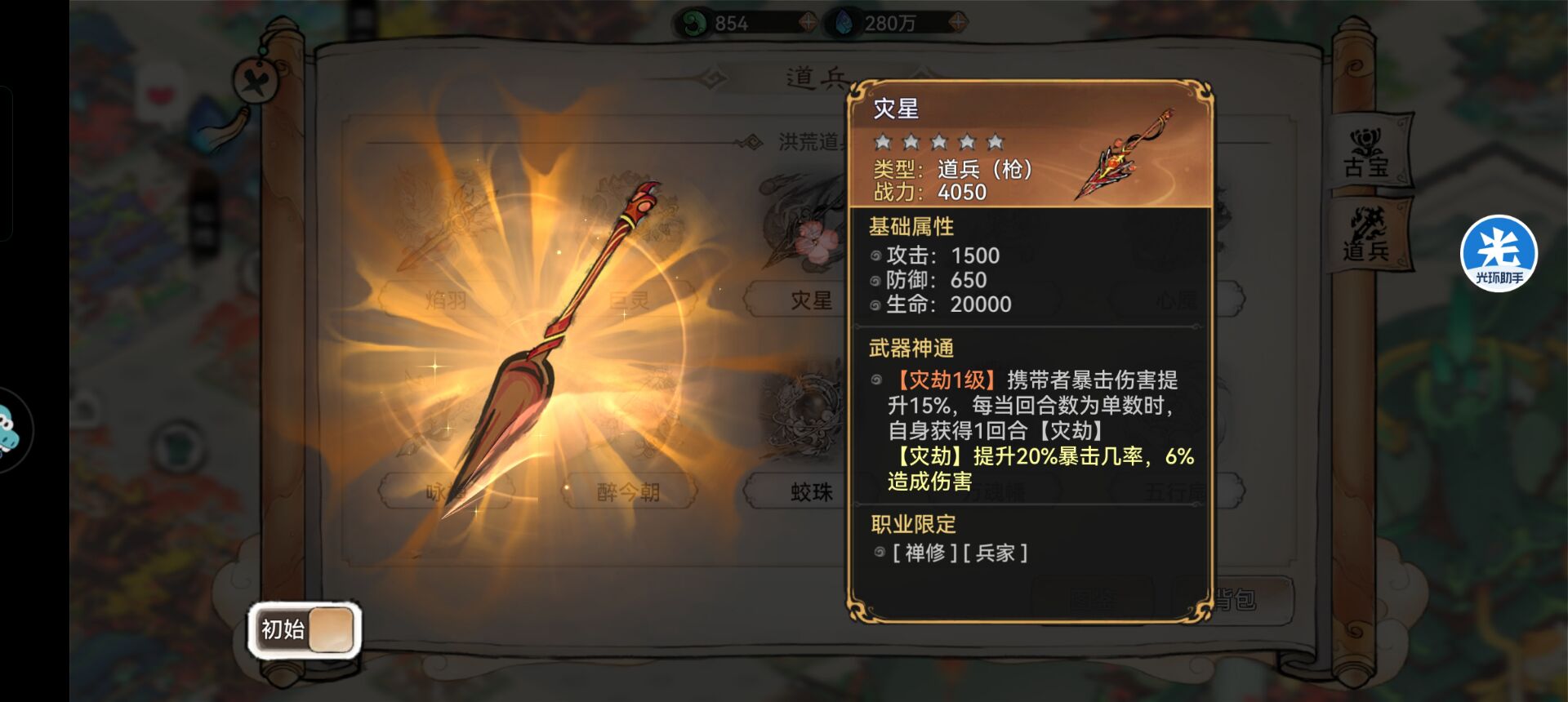 3:【灾星】—搭配推荐。灾星职业限定是:禅修和兵家。其实对于禅修来说不是很适合,因为禅修首先考虑的一定是防御和生存,扛不住伤害,一切都是白搭,而这把道兵提供的是暴击伤害和暴击率,所以不太适合禅修。